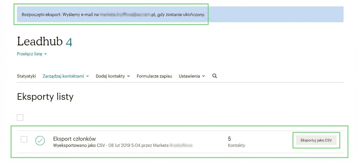 Kontakty z Mailchimpu można wyeksportować w formacie CSV. Zapisane i wypisane kontakty zostaną wyeksportowane jednocześnie, ale w oddzielnych dokumentach, które wystarczy tylko wgrać do Leadhubu. W eksportach nie trzeba wprowadzać żadnych zmian, a wszystkie zawarte w nich informacje bez problemu zostaną zaimportowane do Leadhubu (imię, nazwisko,..).