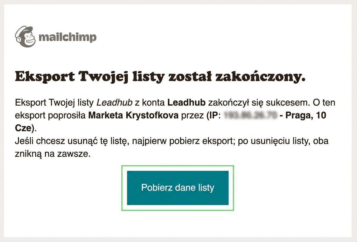 4. Na adres e-mail zarejestrowany w Mailchimpu otrzymasz potwierdzenie, że eksport został zakończony, a jednocześnie ta wiadomość e-mail zawiera również przycisk do szybkiego pobrania eksportu w formacie CSV.