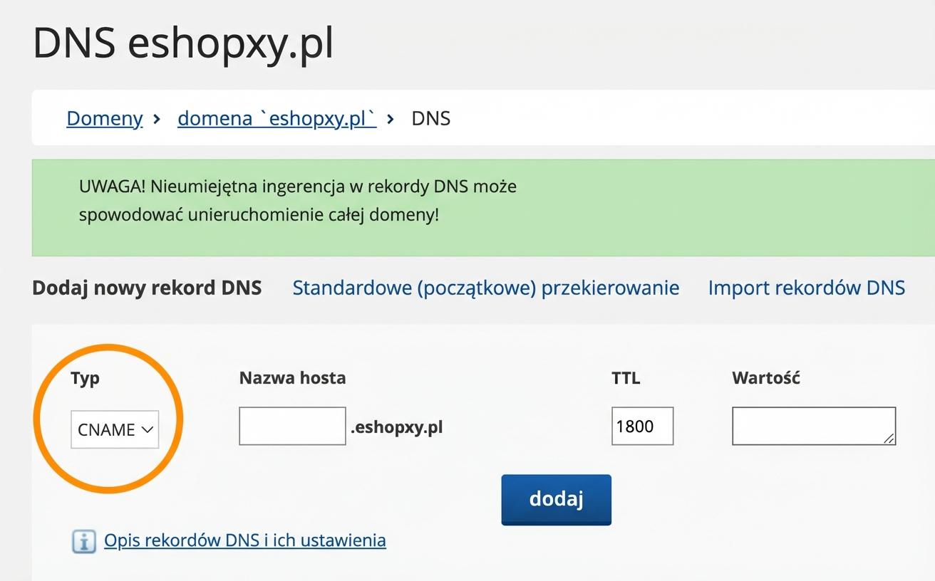 Będziesz dodawać 3 rekordy CNAME, więc w polu "Typ" wybierz we wszystkich przypadkach "CNAME".