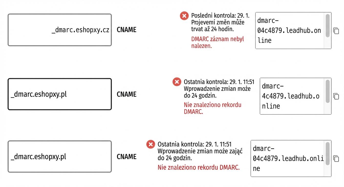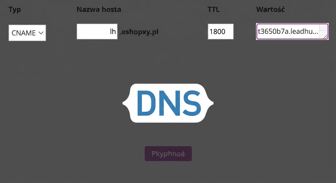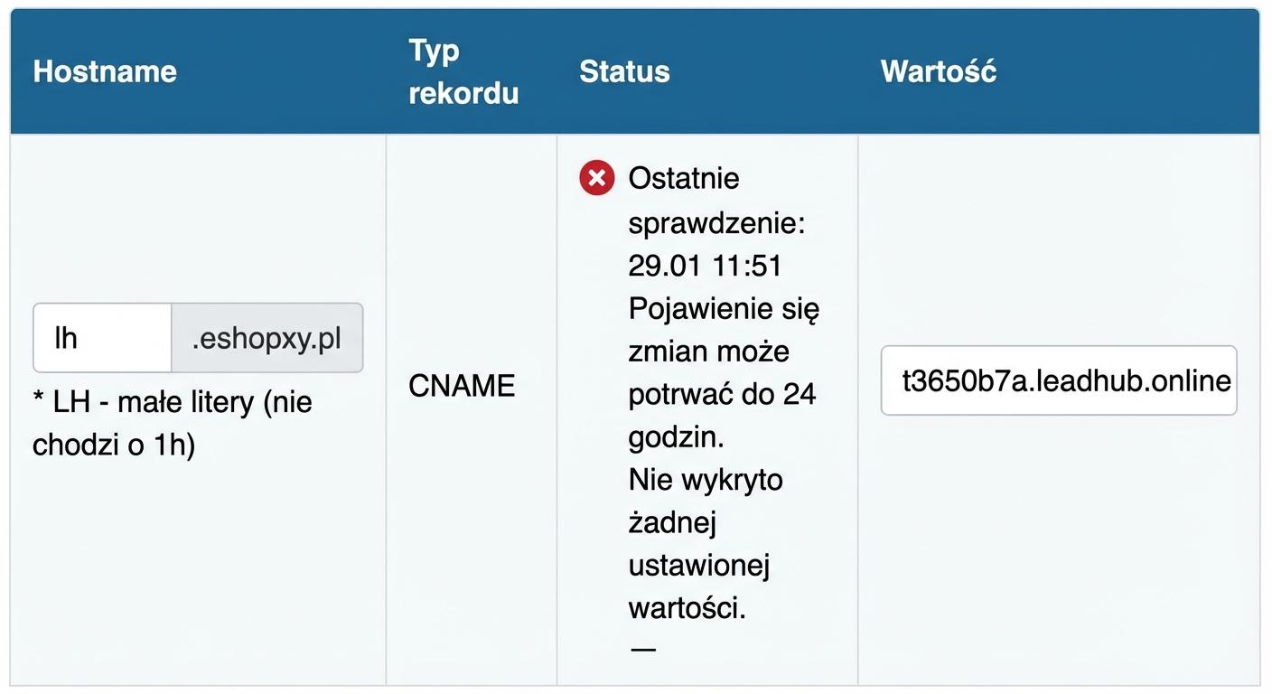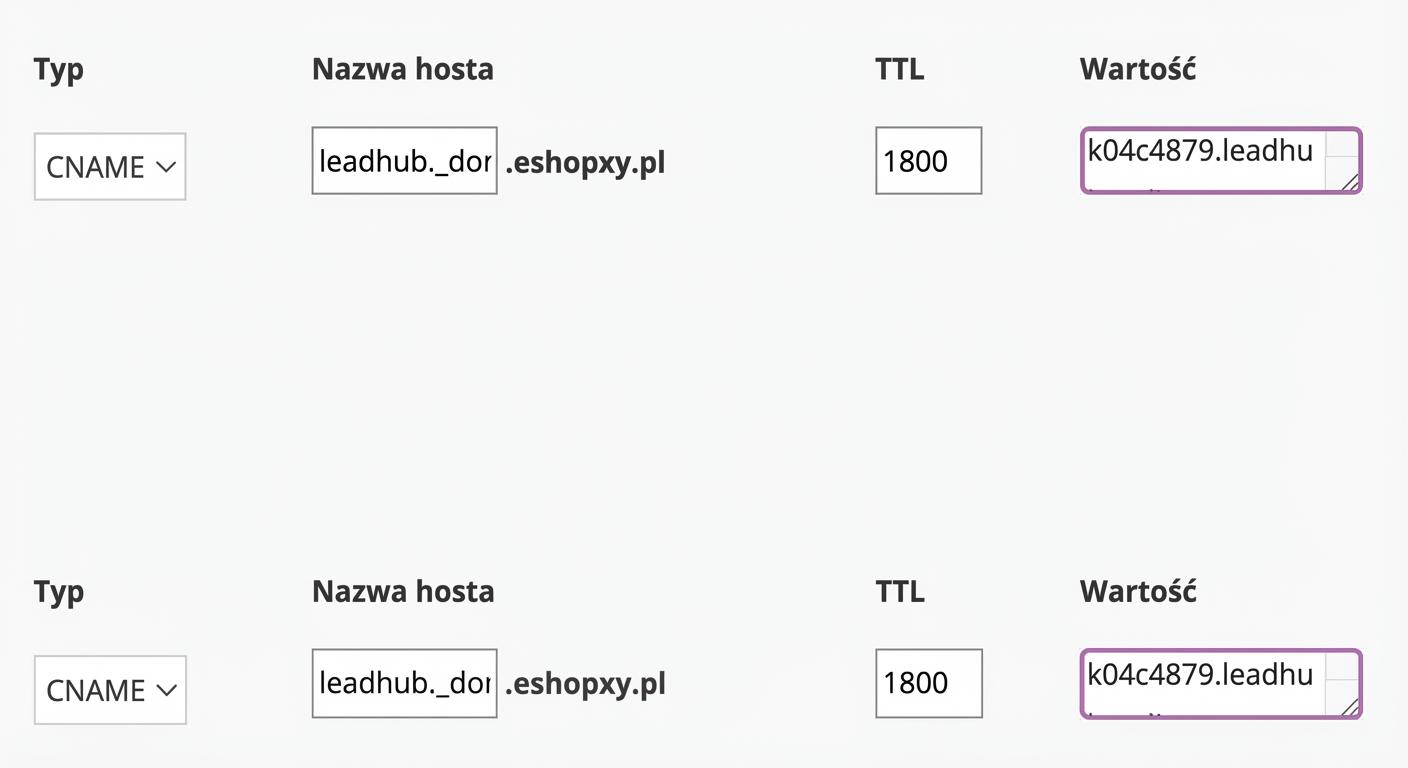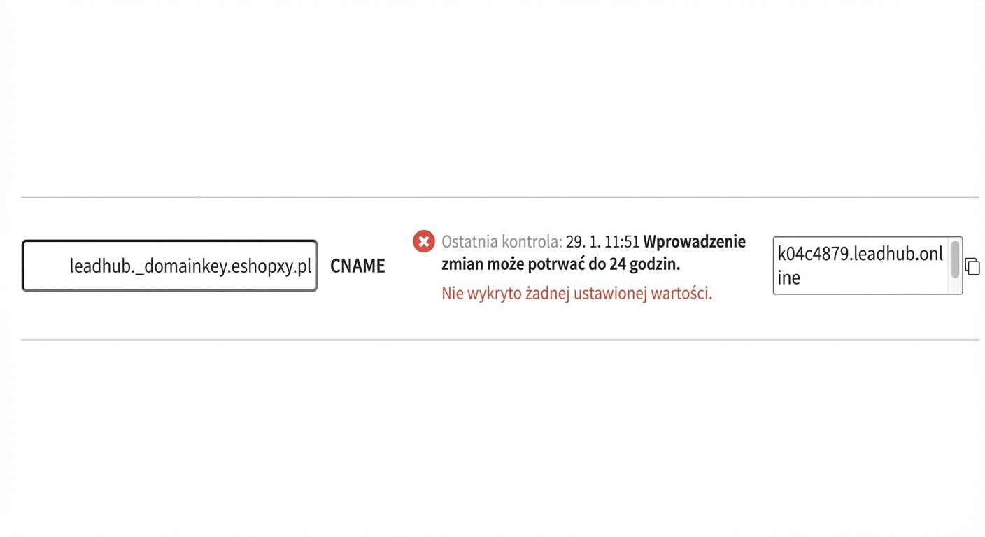 Na swoim koncie w Leadhubie znajdziesz wartości dla 3 rekordów CNAME, które należy dodać u dostawcy Twojej domeny. Dzięki temu automatycznie skonfigurujemy dla Ciebie DMARC, SPF i DKIM.