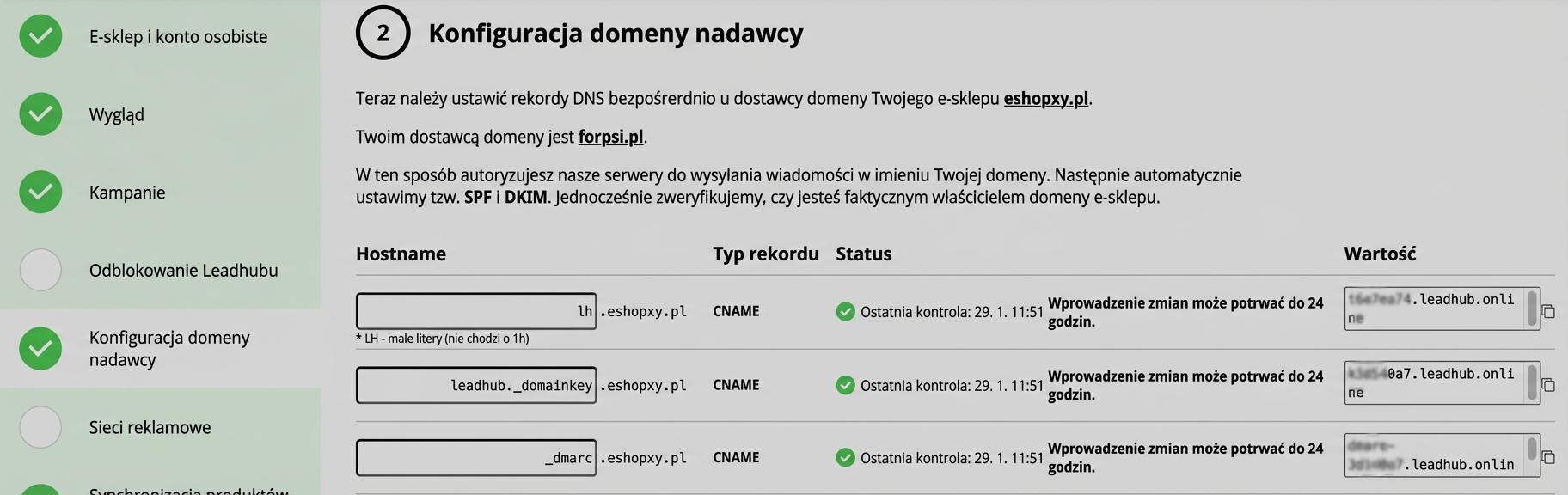 W początkowej konfiguracji w Leadhubie, w zakładce "Ustawienia domeny nadawcy" lub tutaj znajdziesz informację, które rekordy należy skonfigurować u dostawcy Twojej domeny, czyli bezpośrednio w panelu administracyjnym Forpsi.