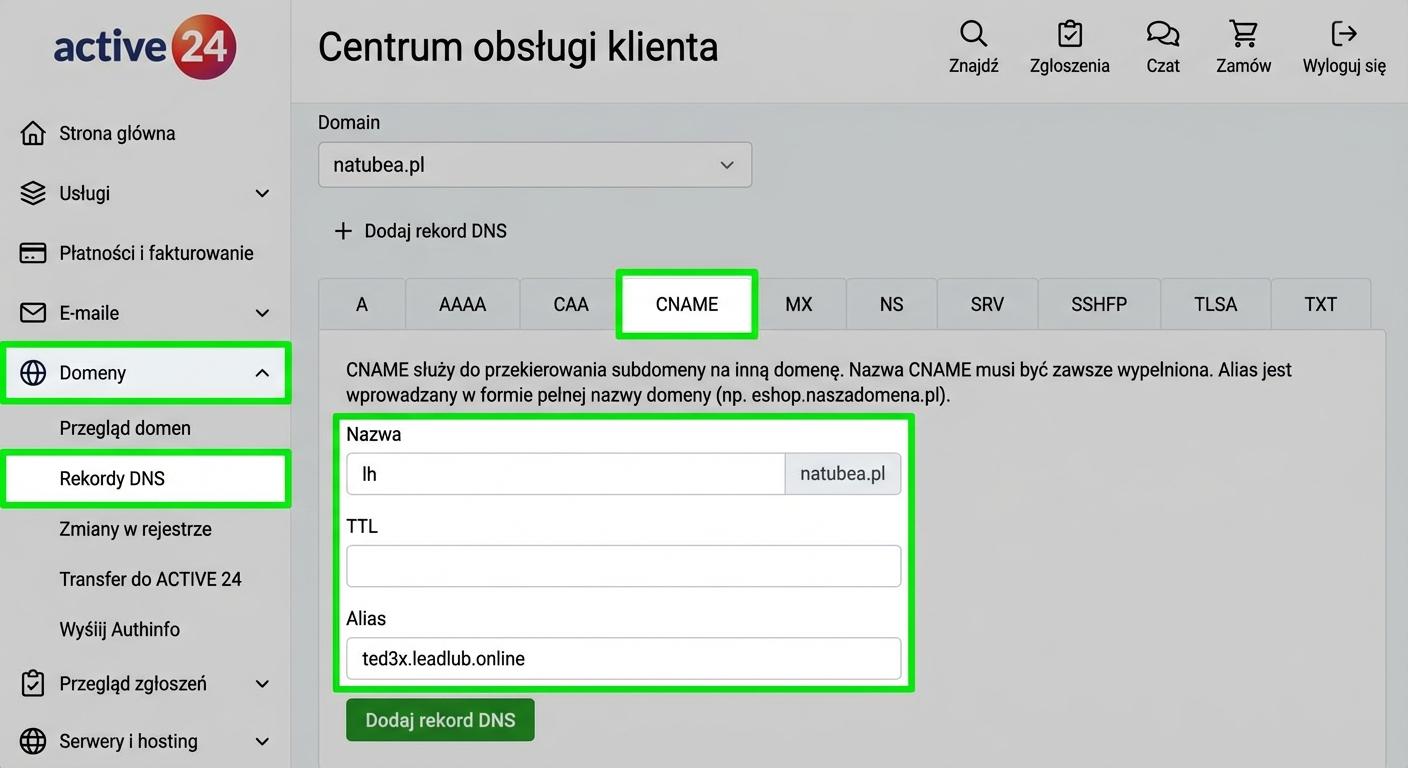 Poprawność konfiguracji rekordów DNS zweryfikujesz w Leadhubie.