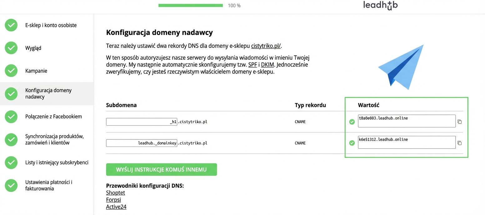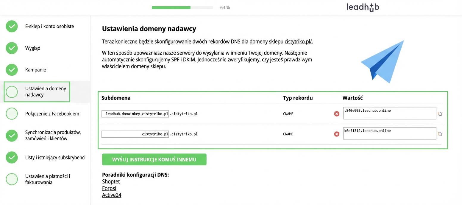 Nazwy subdomen i ich wartości znajdziesz w Leadhubie w zakładce „Ustawienia domeny nadawcy”.
