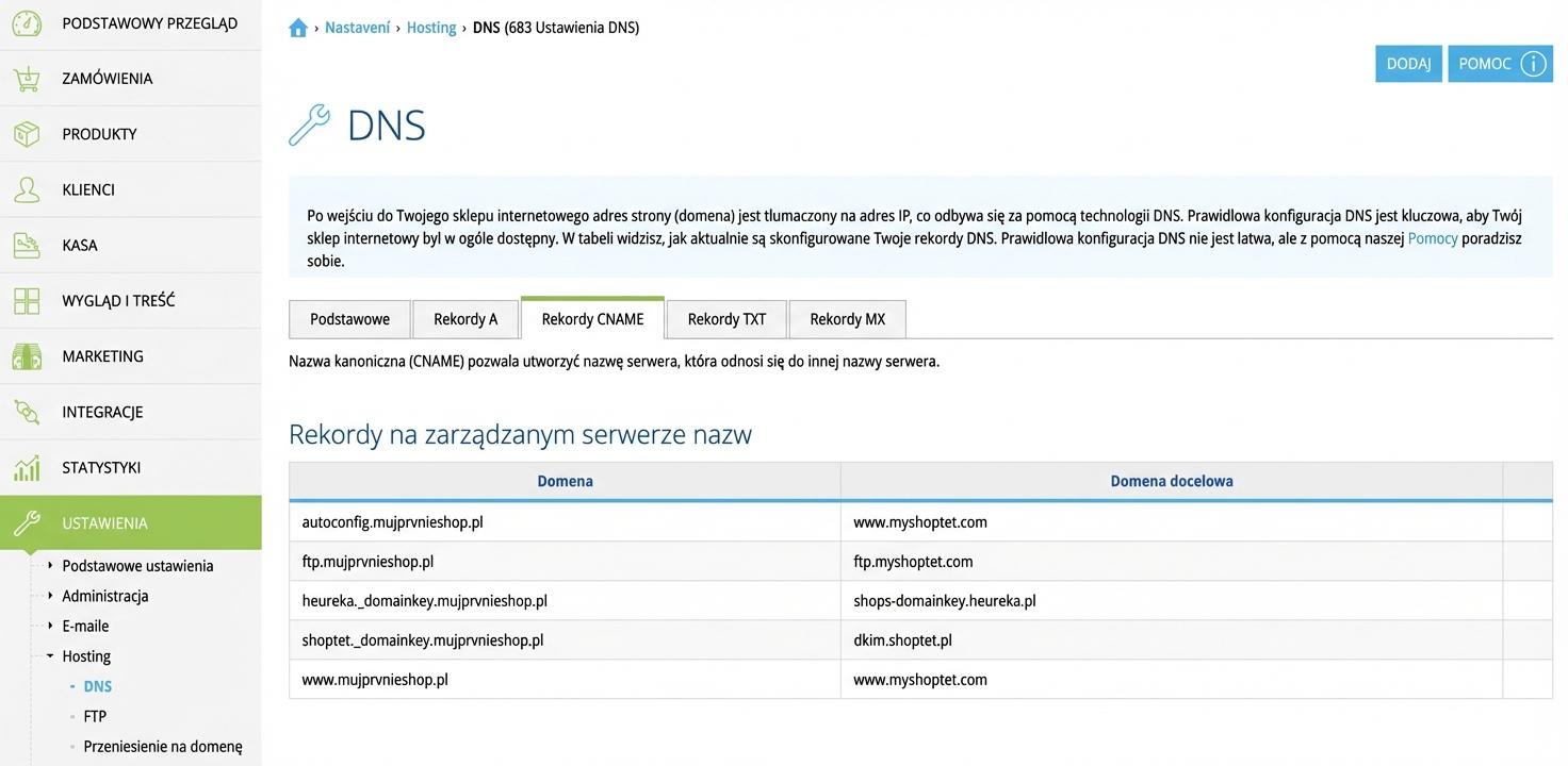 Rekordy CNAME należy skonfigurować zarówno w Active24, jak i bezpośrednio w Shoptet.