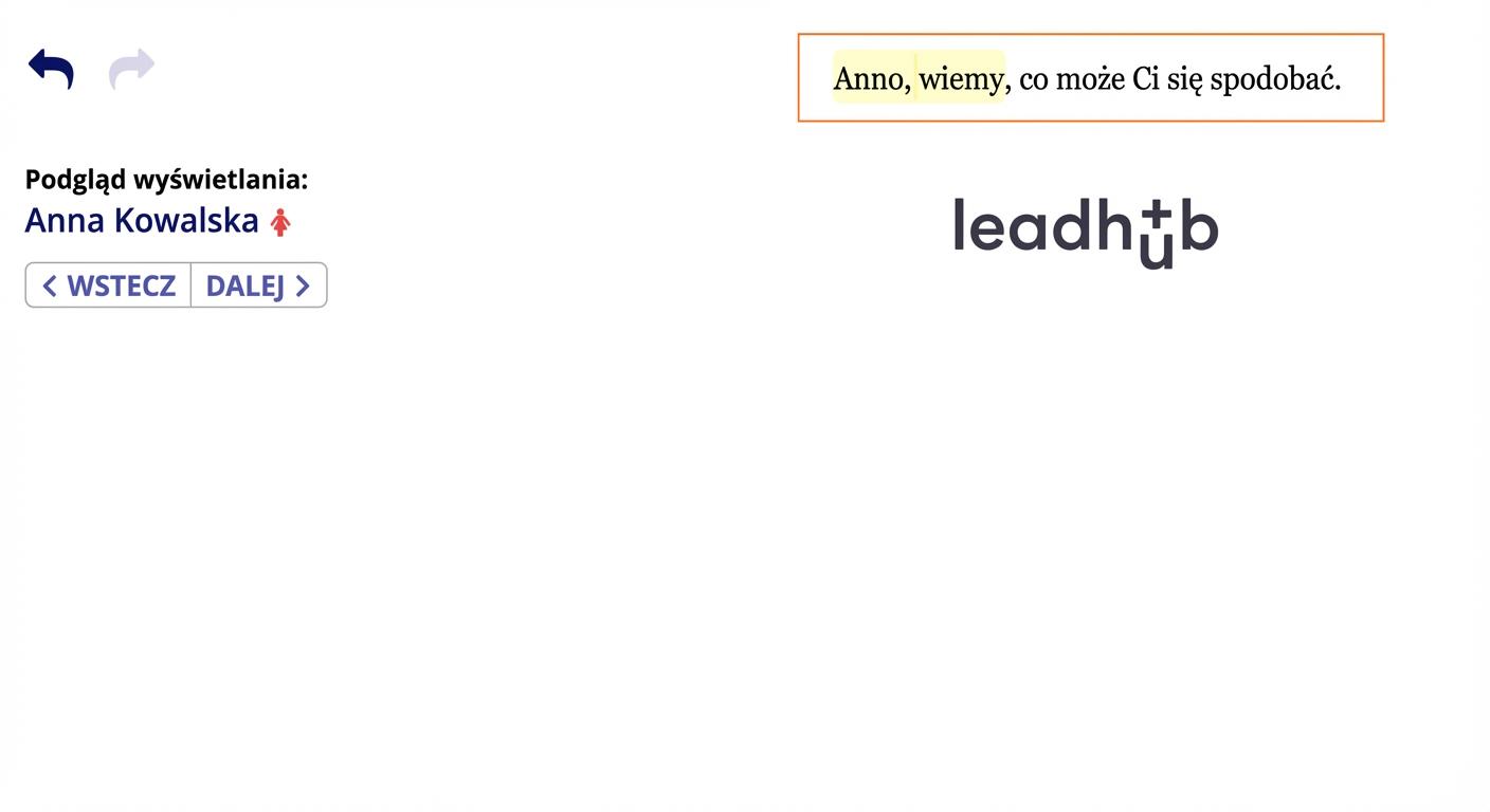 2. W kolejnym kroku, za pomocą opcji „Tekst według płci” wstawisz przecinek po zwrocie grzecznościowym, a jednocześnie przygotujesz początek preheaderu dla wszystkich kontaktów. Dla nieznanych kontaktów należy rozpocząć zdanie wielką literą.