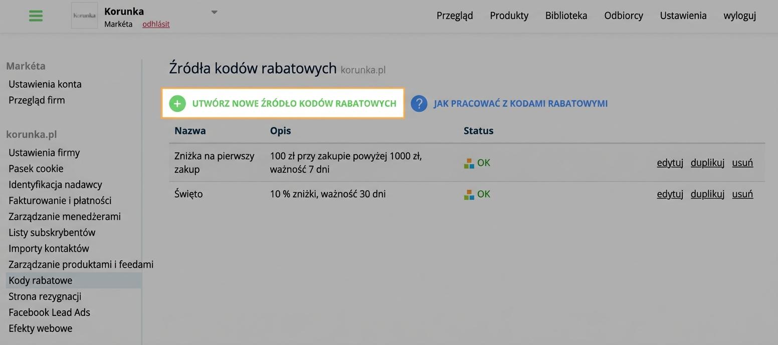 2. Wybierz opcję " Utwórz nowe źródło kodów rabatowych".