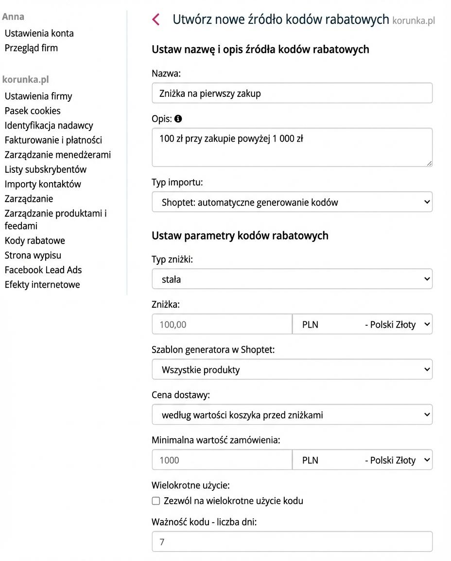 Dla łatwej orientacji i przejrzystości nazwij źródło kodów rabatowych (zasobnik), np. według kampanii, w której będzie użyte ("Zniżka na pierwszy zakup"). Następnie ustaw parametry kodów rabatowych (stała/procentowa wartość rabatu, minimalna wartość zakupu, ważność kodu rabatowego). Zapisz.