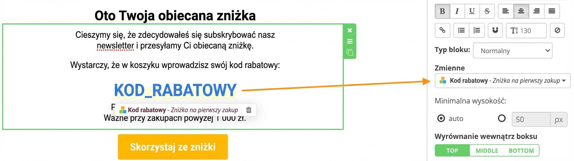 3. Przejdź do kampanii, w której chcesz użyć utworzonego źródła kodów rabatowych. W polu tekstowym wybierz z "zmiennych" odpowiednie źródło i w razie potrzeby sformatuj je.