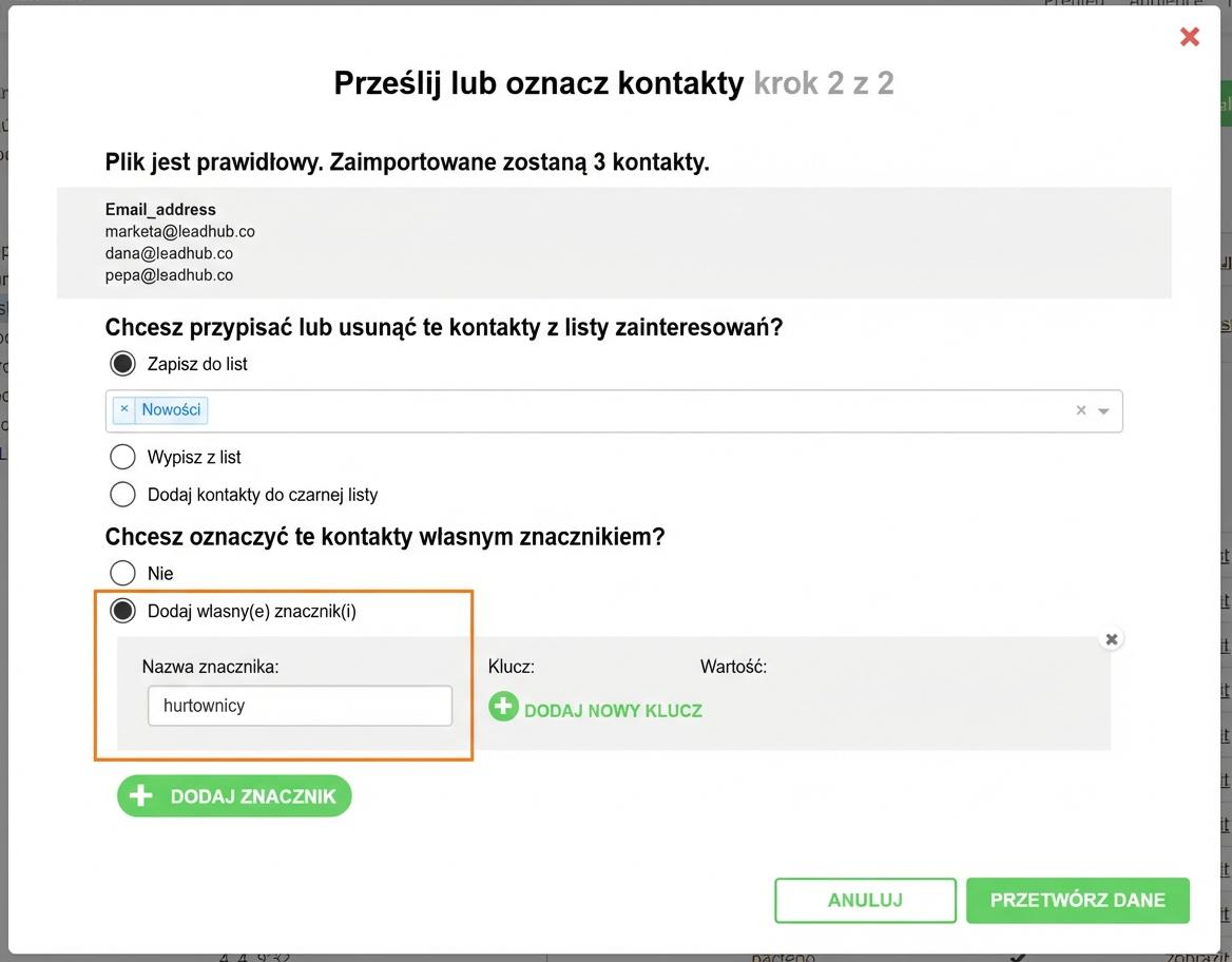 2. utworzenie nowej listy subskrybentów wyłącznie dla kontaktów hurtowników