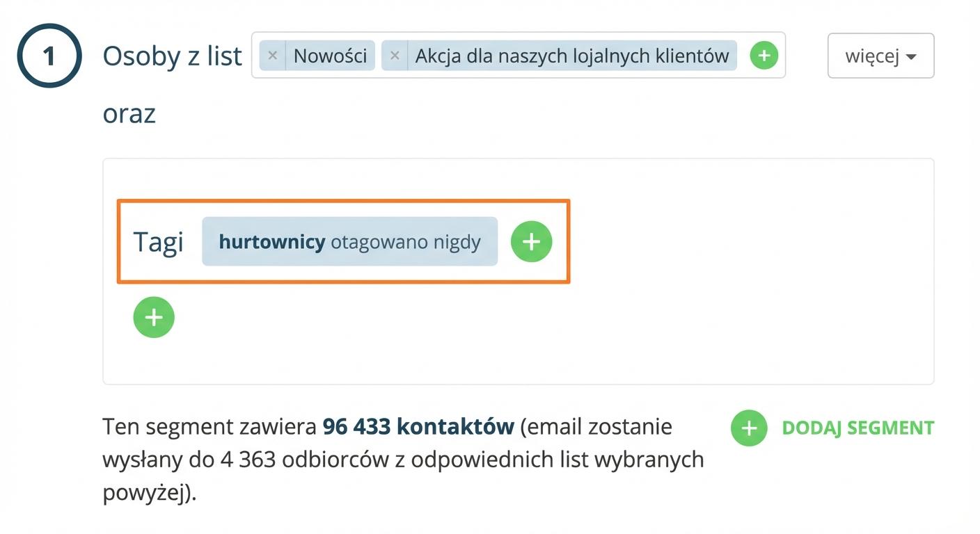 Albo odwrotnie — łatwo wykluczysz ich z wysyłki, dodając warunek "nigdy" - odbiorcy nigdy nie zostali oznaczeni etykietą hurtownicy.