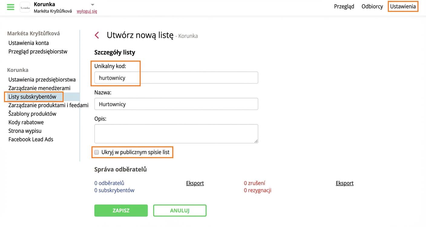 W ustawieniach konta, w zakładce "Listy subskrybentów" utwórz nową listę subskrybentów. Jako unikalny kod listy wybierz na przykład "hurtownicy".