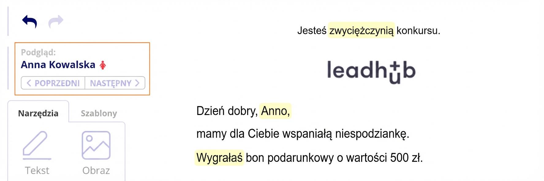 Trzeba też pamiętać o kontaktach, dla których nie masz dostępnych imienia i nazwiska. W takim przypadku Leadhub nie rozpozna, czy chodzi o mężczyznę, czy kobietę. Dlatego konieczne jest ustawienie personalizacji tekstu również dla nieznanych kontaktów (pole "Fallback text").