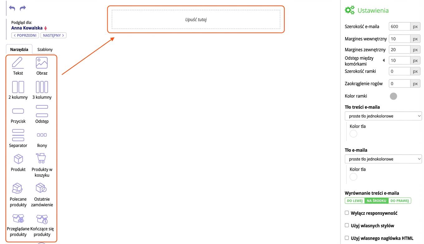 Dzięki Edytorowi typu drag & drop ("przeciągnij i upuść") poradzisz sobie z tworzeniem newsletterów bez znajomości HTML i CSS. Samym przeciągnięciem myszą rozmieszczasz poszczególne elementy w treści e-maila.