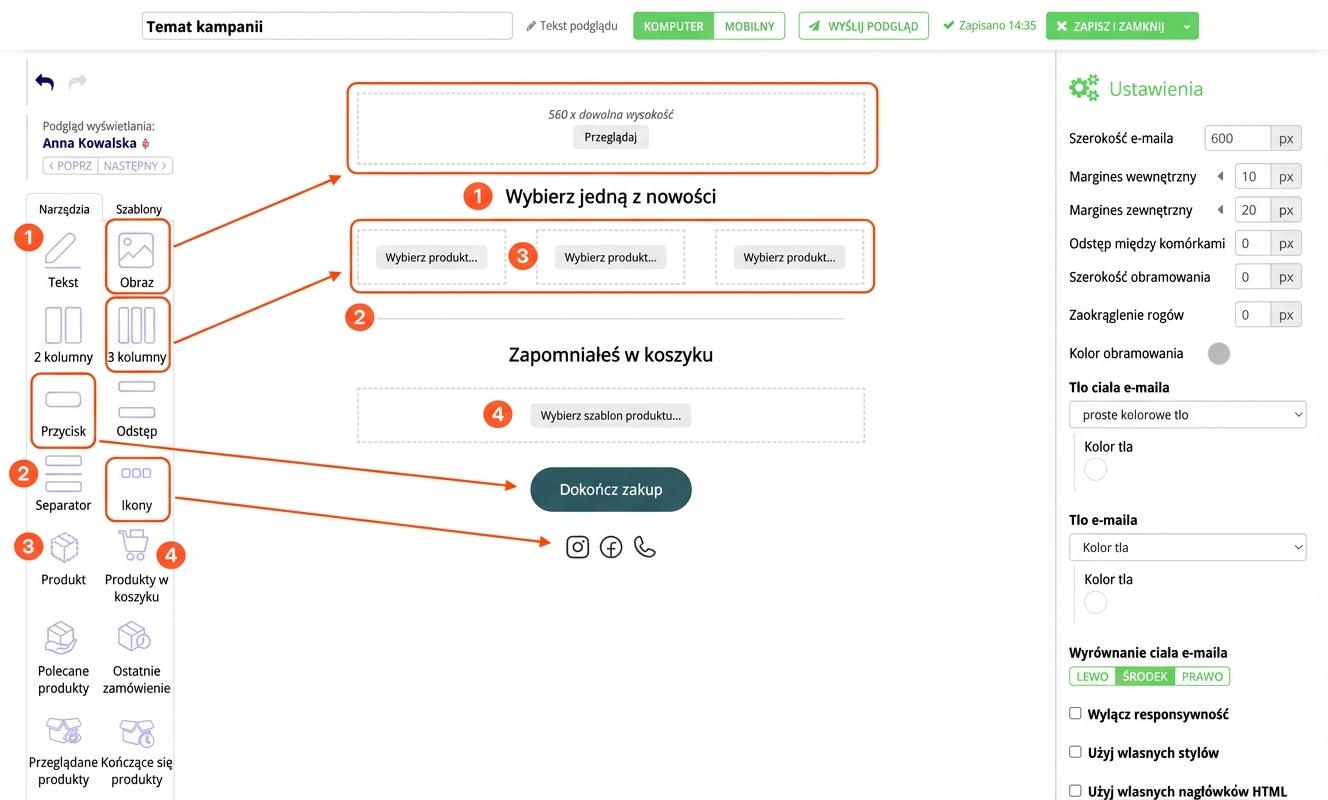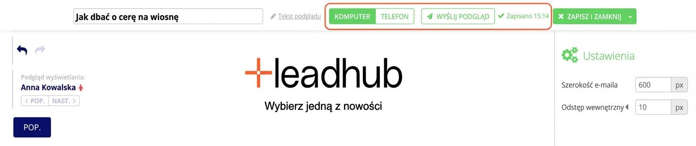 W górnej części edytora znajdują się opcje wysłania podglądu e-maila oraz jego wyświetlenia na urządzeniach mobilnych. Wszystkie wprowadzone zmiany zapisują się automatycznie po każdej edycji wykonanej w edytorze.