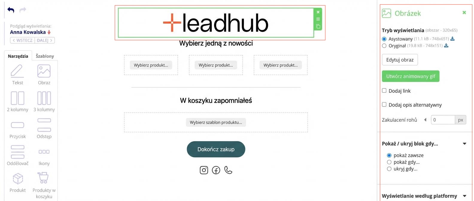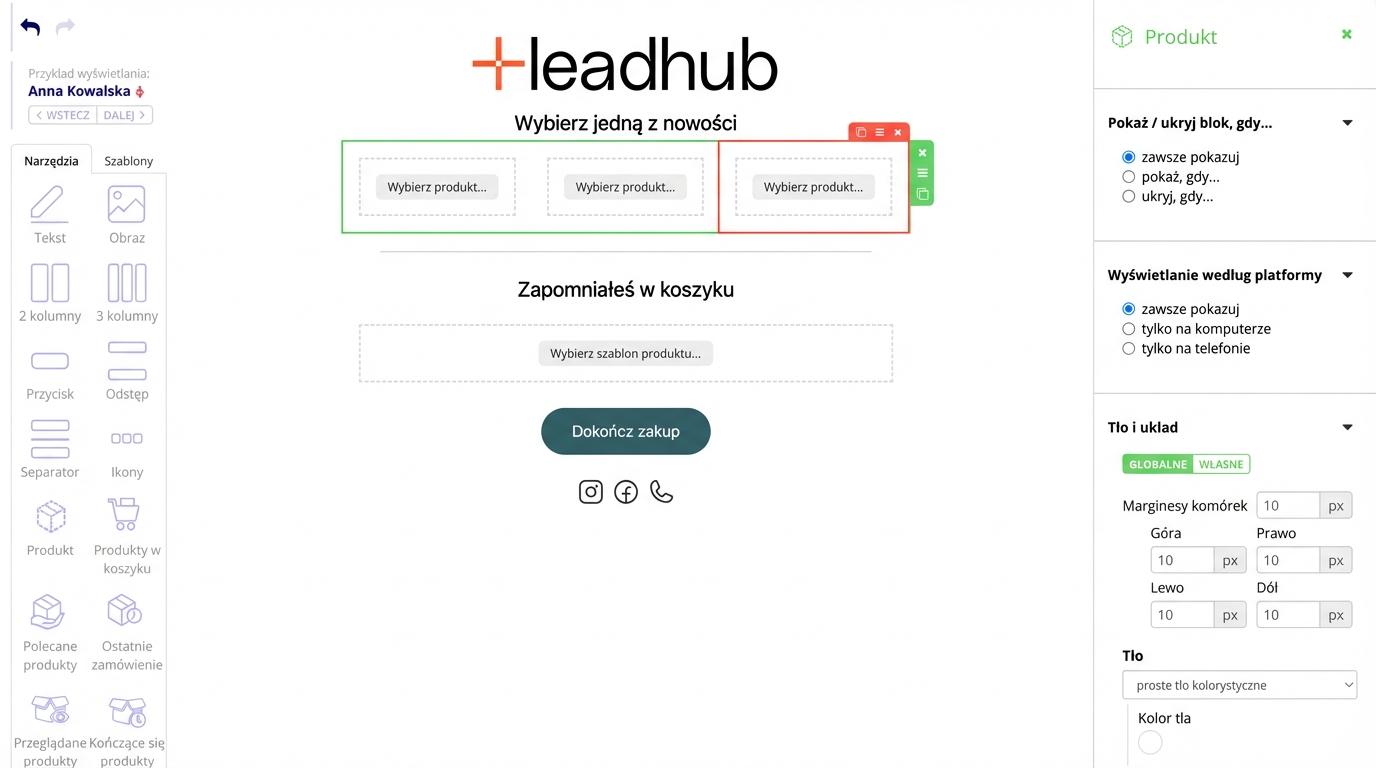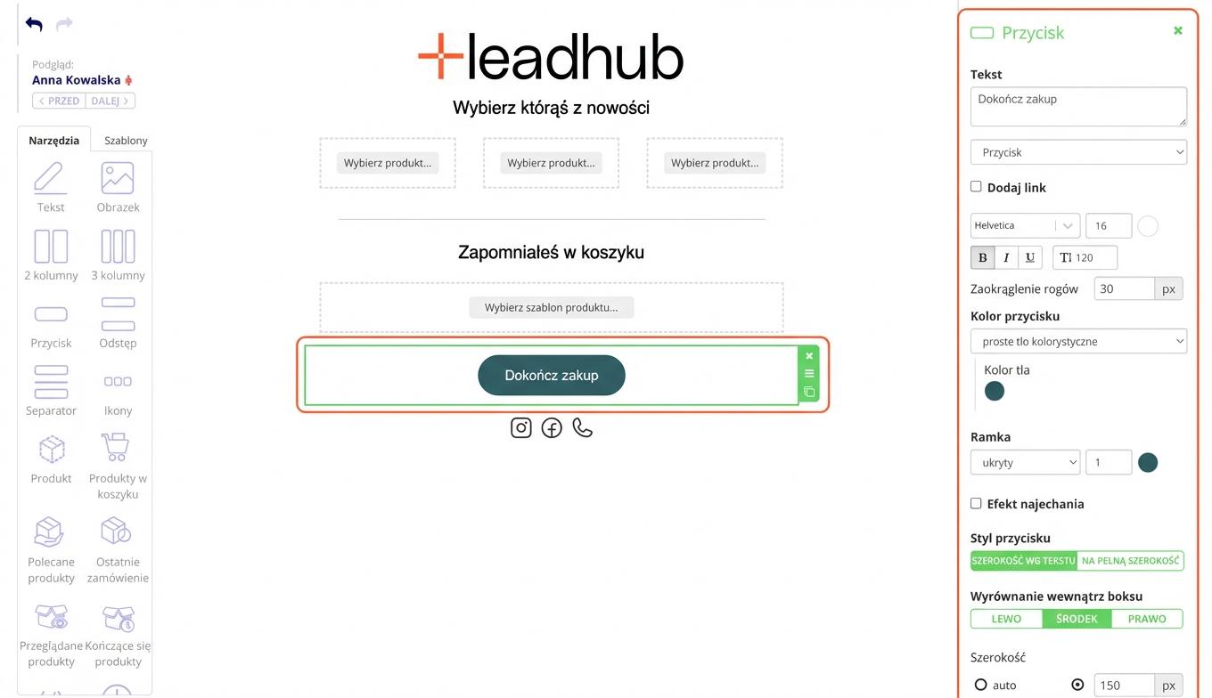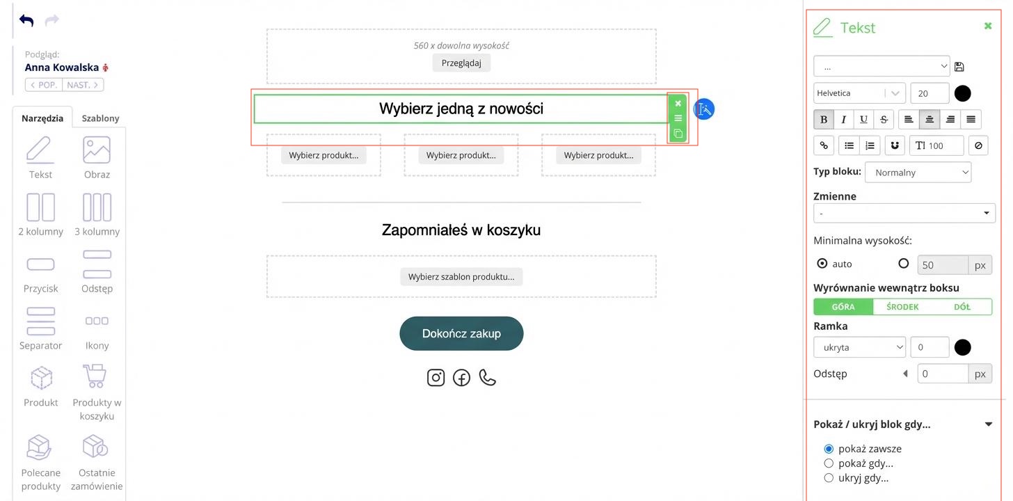 Klikając na obiekt w treści e-maila, zaznaczysz go, a w prawej części edytora edytujesz/nadasz styl zgodnie z potrzebami. Cały obiekt można usunąć, przenieść lub zduplikować za pomocą nawigacji po prawej stronie zielonej ramki.