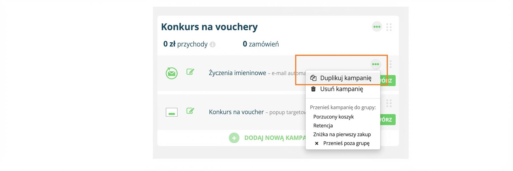 Opcja duplikacji znajduje się na końcu wiersza przy wybranej kampanii pod trzema kropkami.