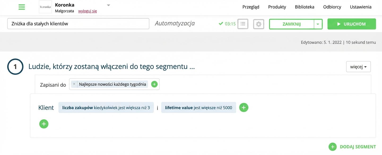 2. Wybierz Segmentacja, za pomocą którego określisz, kiedy i do kogo będzie wysyłany automatyczny e-mail