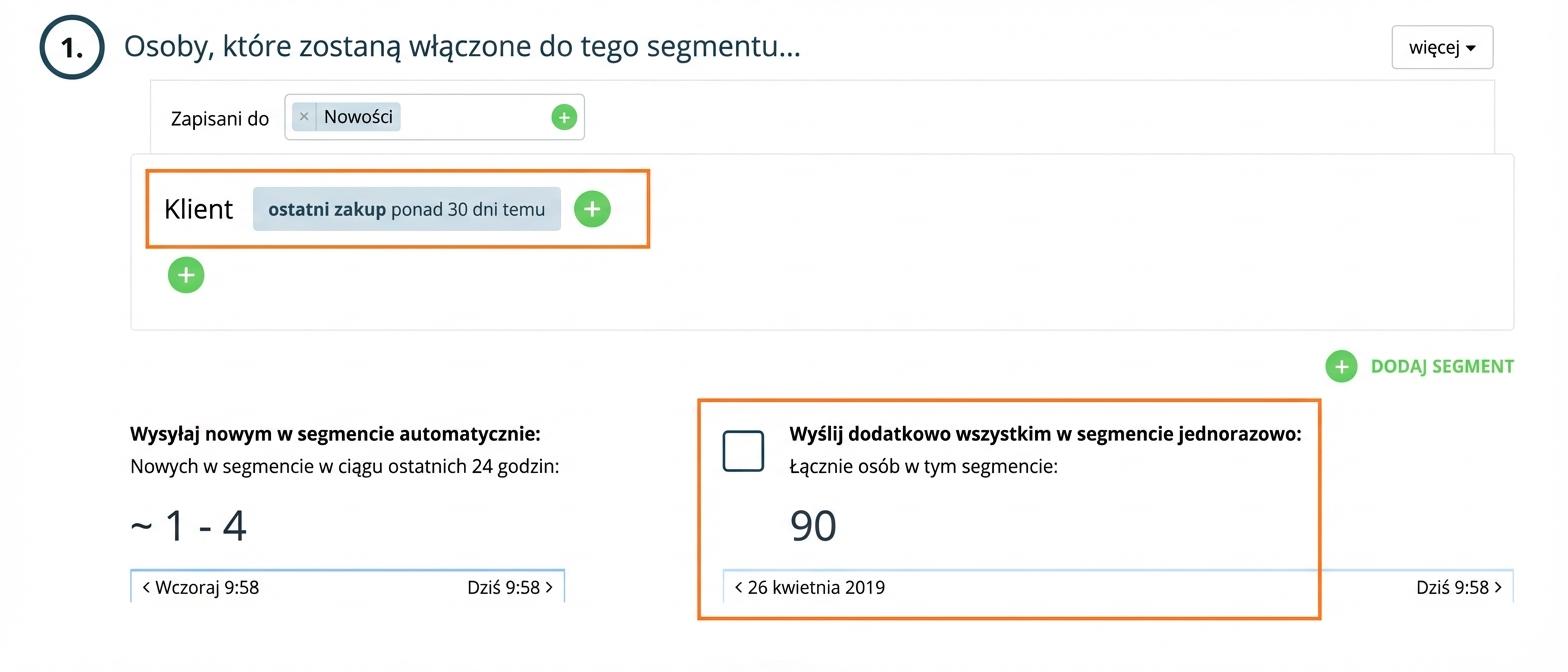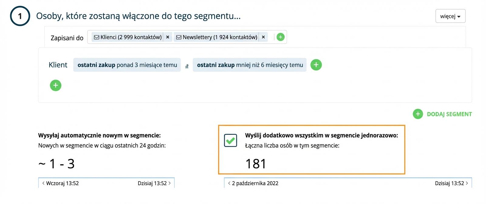 Po zaznaczeniu checkboxa „Wyślij dodatkowo jednorazowo do wszystkich w segmencie” automatyczny e-mail zostałby wysłany do tych 90 odbiorców, z których jednak niektórzy mogli dokonać zakupu nawet ponad rok temu albo nawet dwa lata temu. Oznacza to, że grupa odbiorców może zawierać historyczne, nieaktywne kontakty, z którymi nie chcesz już komunikować się za pomocą e-mailingu. Jeśli treść e-maila jest do tego dostosowana i jest to Twoim zamiarem, to w porządku. Jeśli nie, nie zaznaczaj tej opcji.