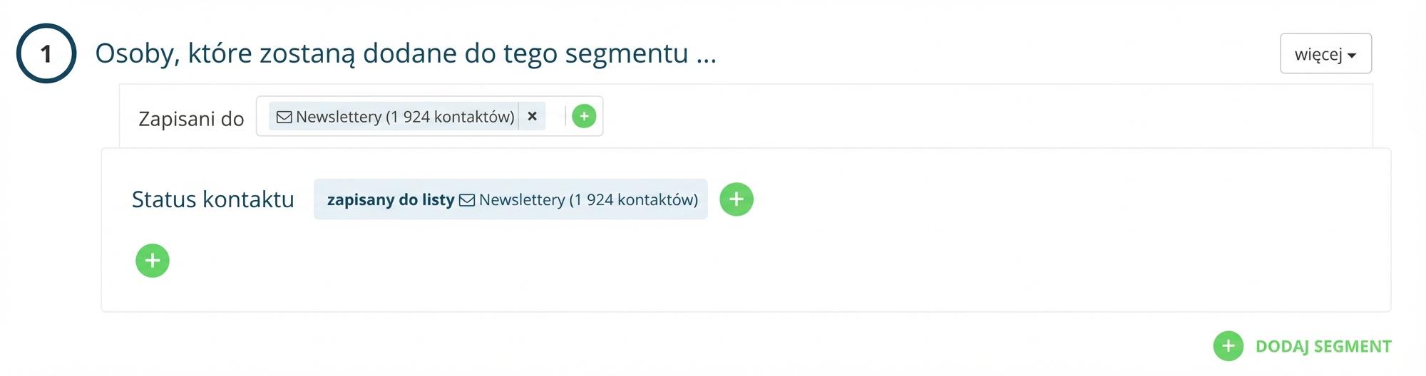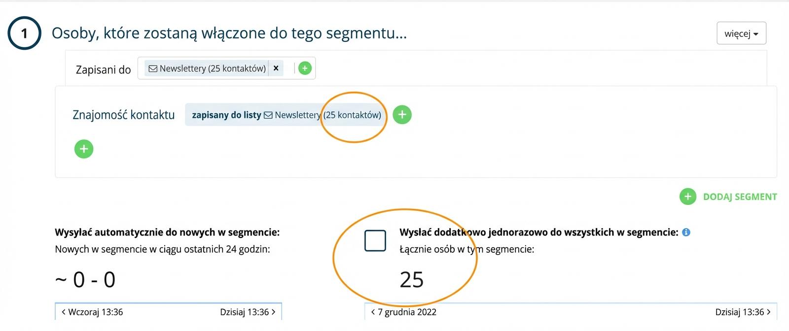 Problem może jednak pojawić się w przypadku, gdy wybierzesz opcję „Wyślij dodatkowo jednorazowo do wszystkich w segmencie”. Dlaczego? E-mail powitalny zostałby wysłany do wszystkich kontaktów, które masz w bazie. Wszyscy bowiem spełniają warunek „zapisany na listę Newsletters”. E-mail zostałby wysłany do kontaktów, które zapisały się na e-mailing na przykład 1 dzień temu, 6 miesięcy temu, rok temu albo nawet dwa lata temu.