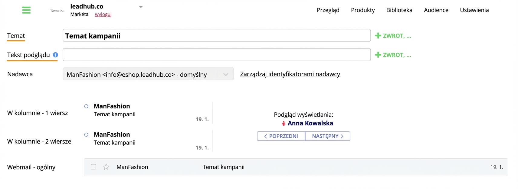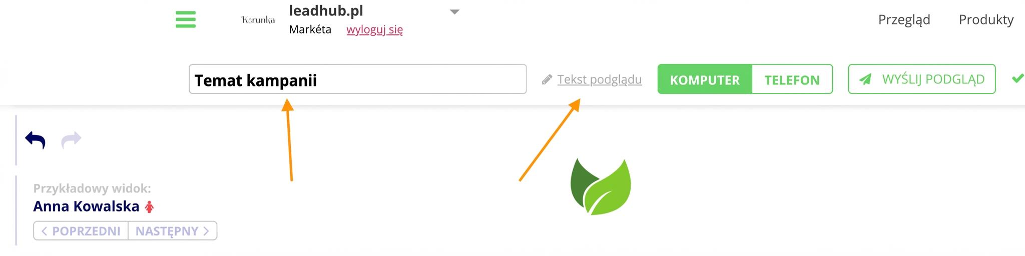 Bezpośrednio w edytorze w Leadhubu ustawisz zarówno temat kampanii, jak i preheader (tekst podglądu).
