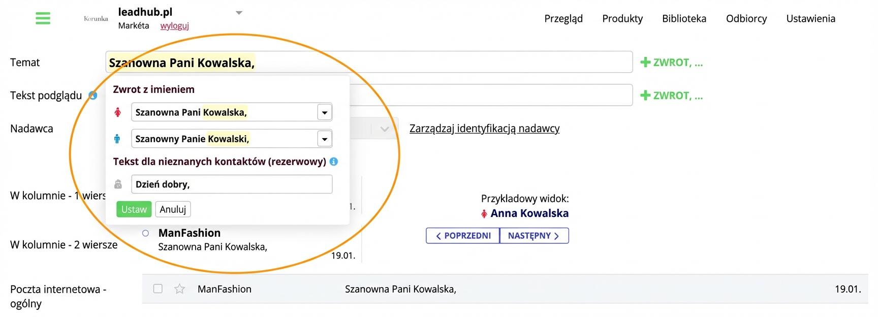 3. Pojawi się okno dialogowe, w którym ustawisz zwrot grzecznościowy oraz spersonalizowany tekst w zależności od płci.