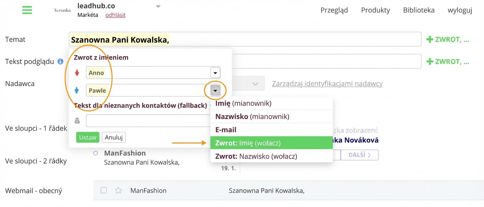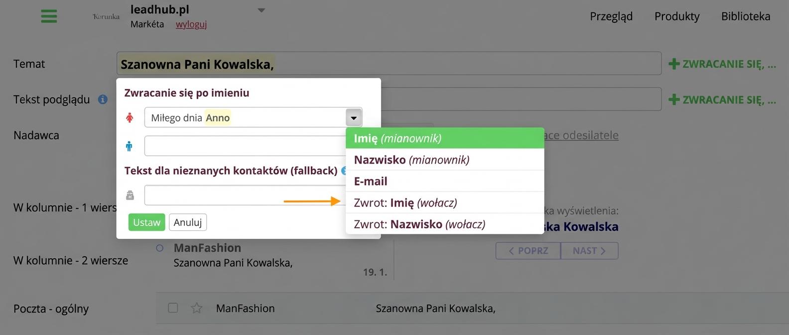 1. Usuń przygotowany zwrot grzecznościowy. Następnie kliknij strzałkę na końcu wiersza i w obu polach (dla mężczyzn i kobiet) wybierz opcję „Zwrot grzecznościowy: Imię (wołacz)”.