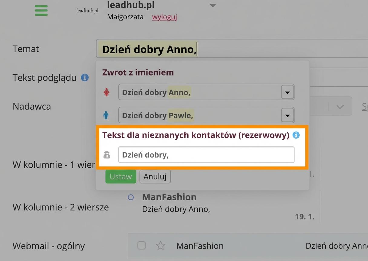 Zawsze uzupełnij także pole „Tekst dla nieznanych kontaktów”. Za nieznany kontakt uznaje się w tym przypadku taki, dla którego dostępny jest tylko e-mail, ale z jakiegoś powodu brakuje imienia i nazwiska. System nie ma wtedy możliwości rozpoznania płci.