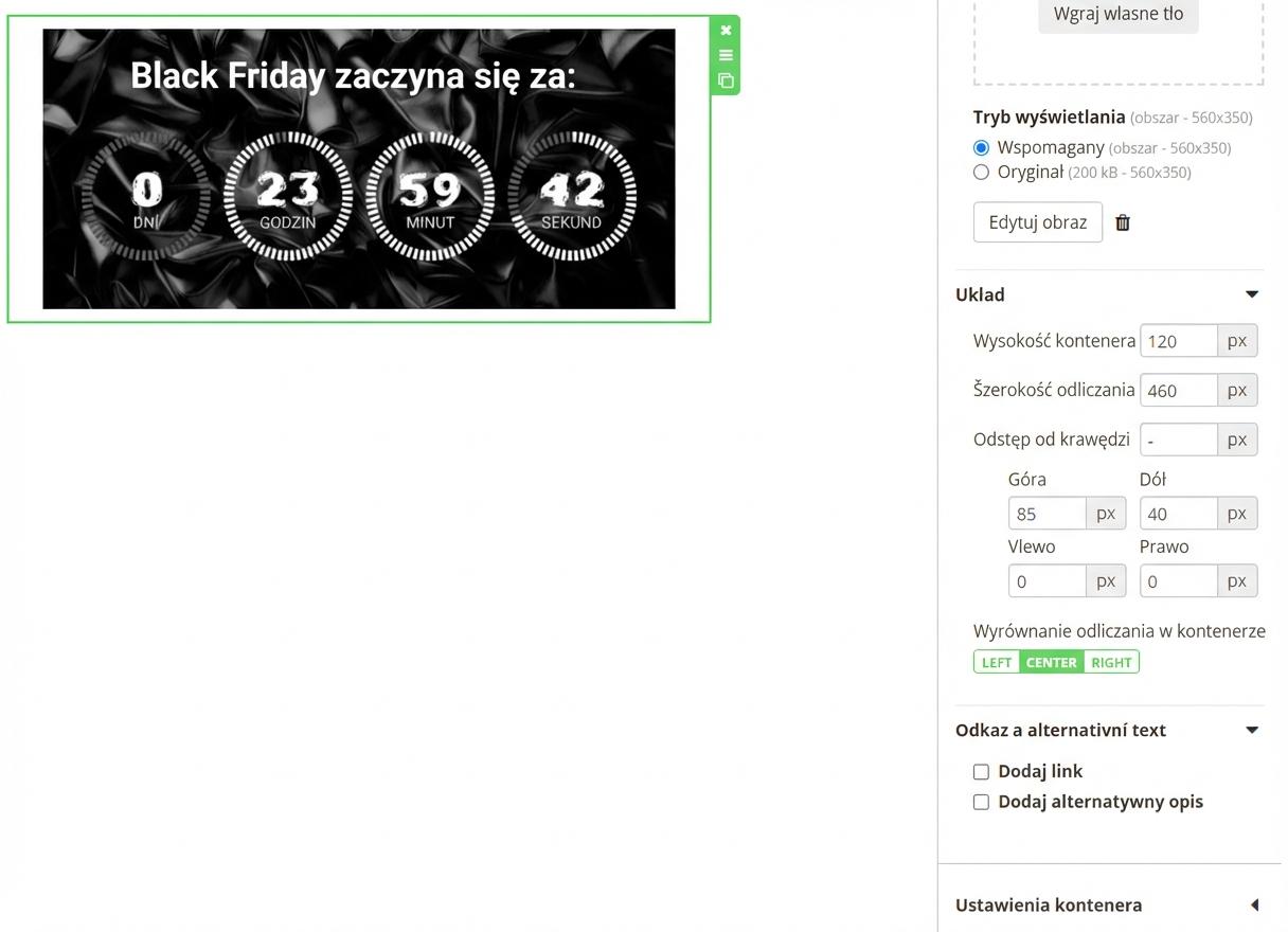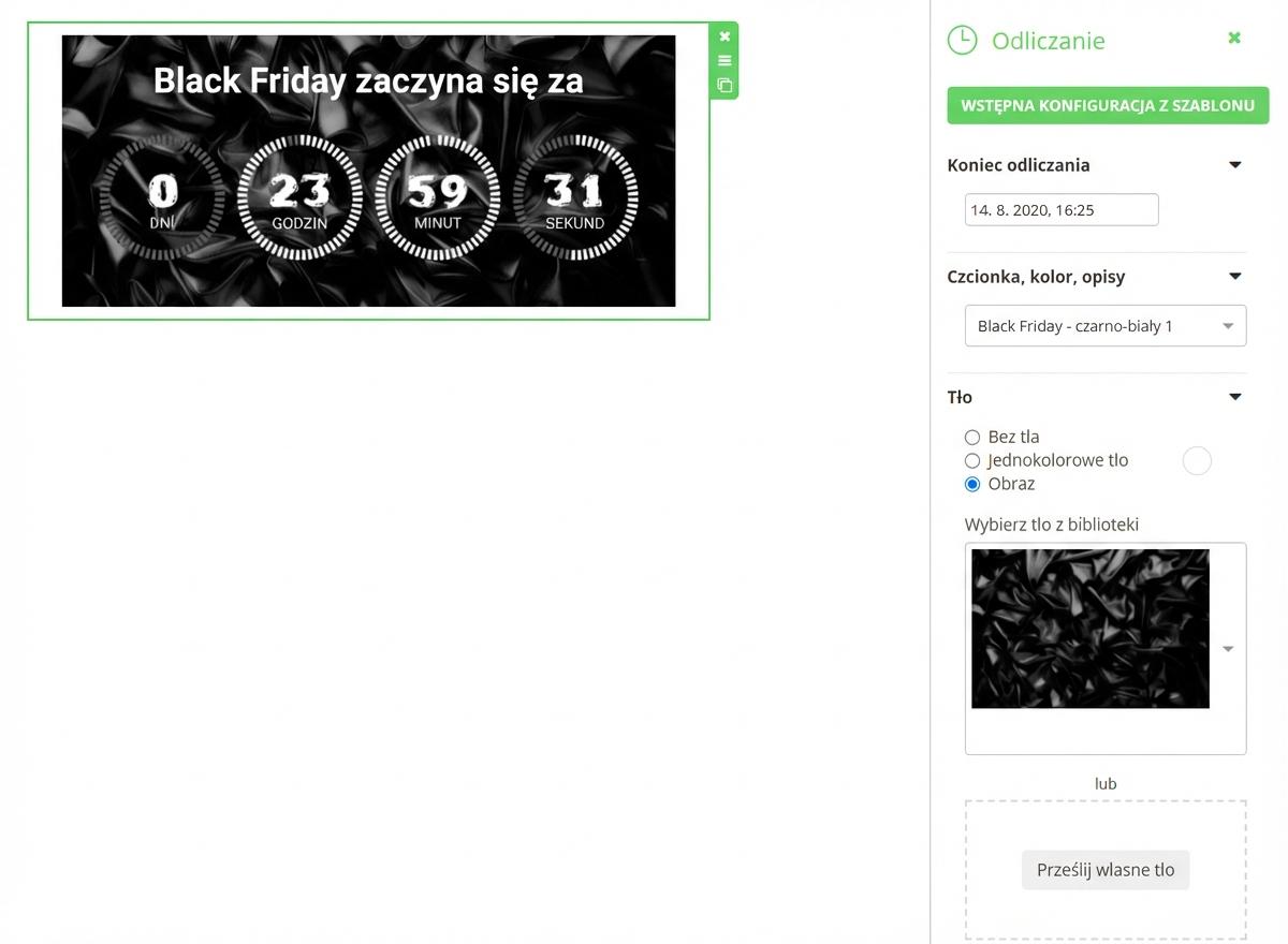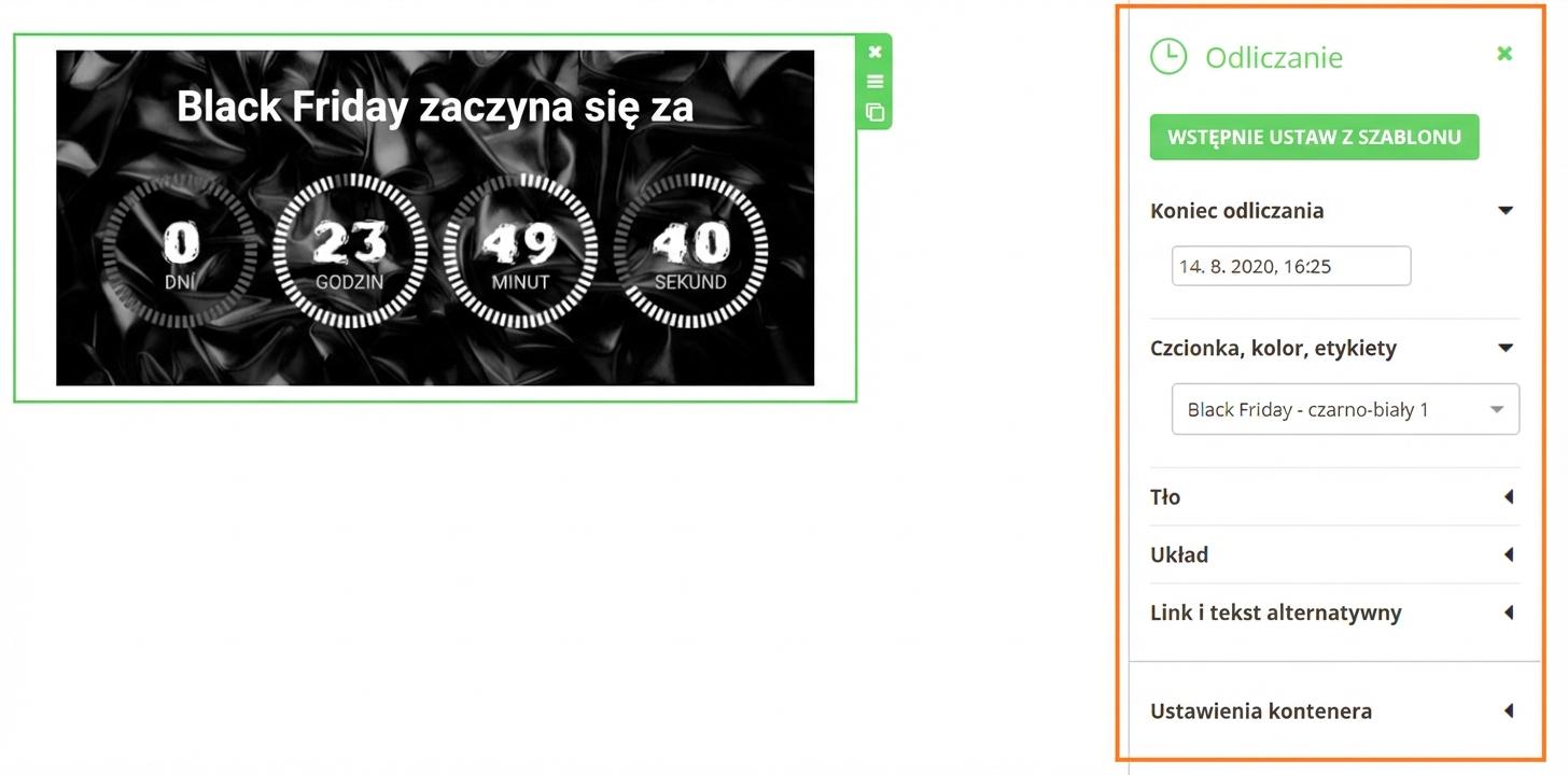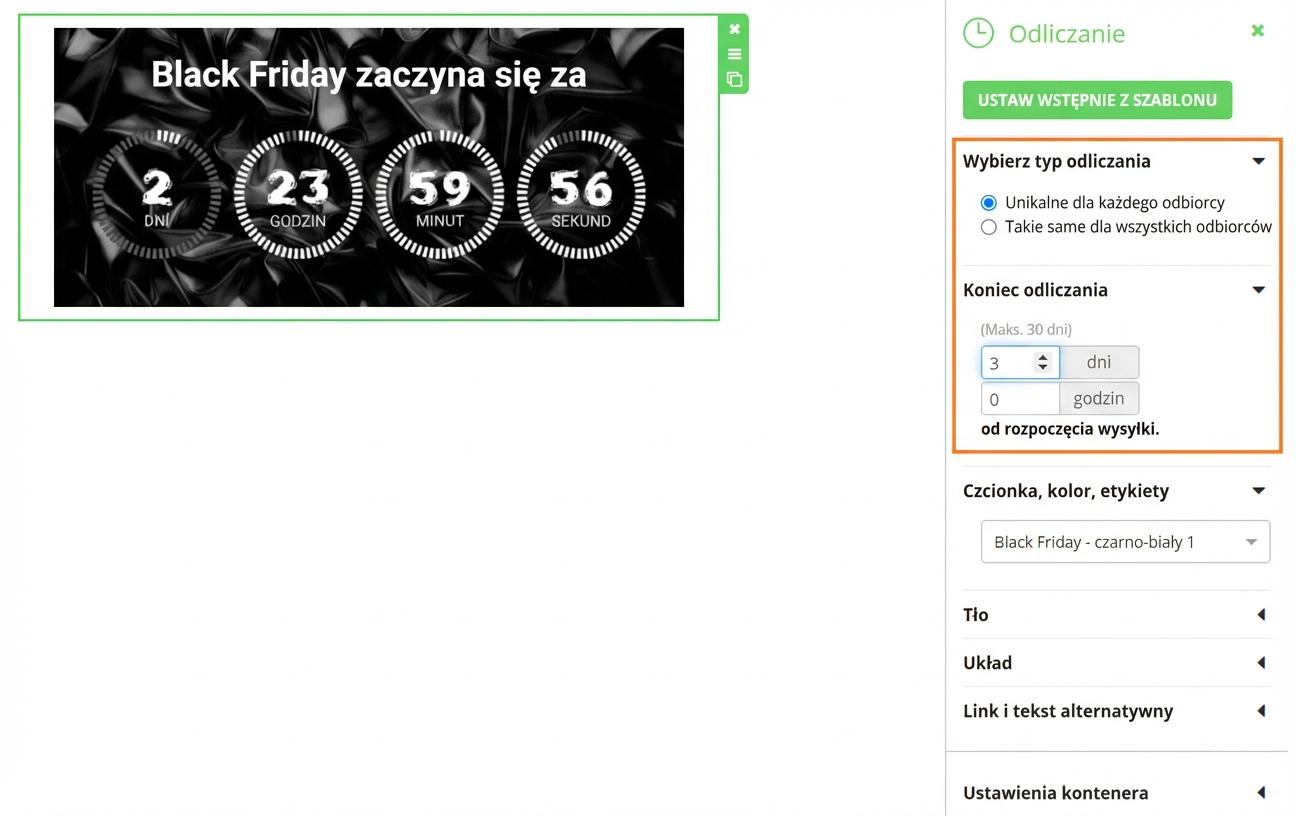 Jeśli wybierzesz jeden z przygotowanych szablonów, po kliknięciu zielonego przycisku „Ustawić z szablonu” wystarczy na niego kliknąć, a zostanie automatycznie wstawiony do e-maila. Przygotowane odliczania są w pełni edytowalne i możesz je dalej modyfikować. Dzięki rozbudowanym opcjom możesz też stworzyć odliczanie dokładnie według siebie.