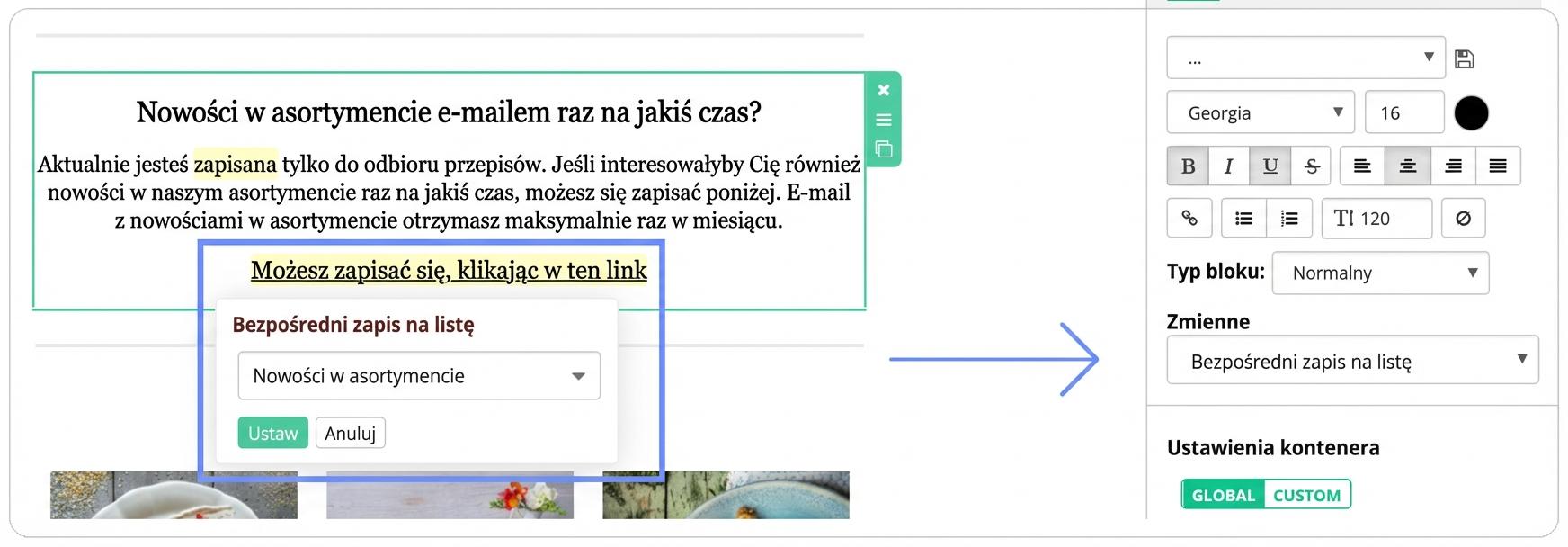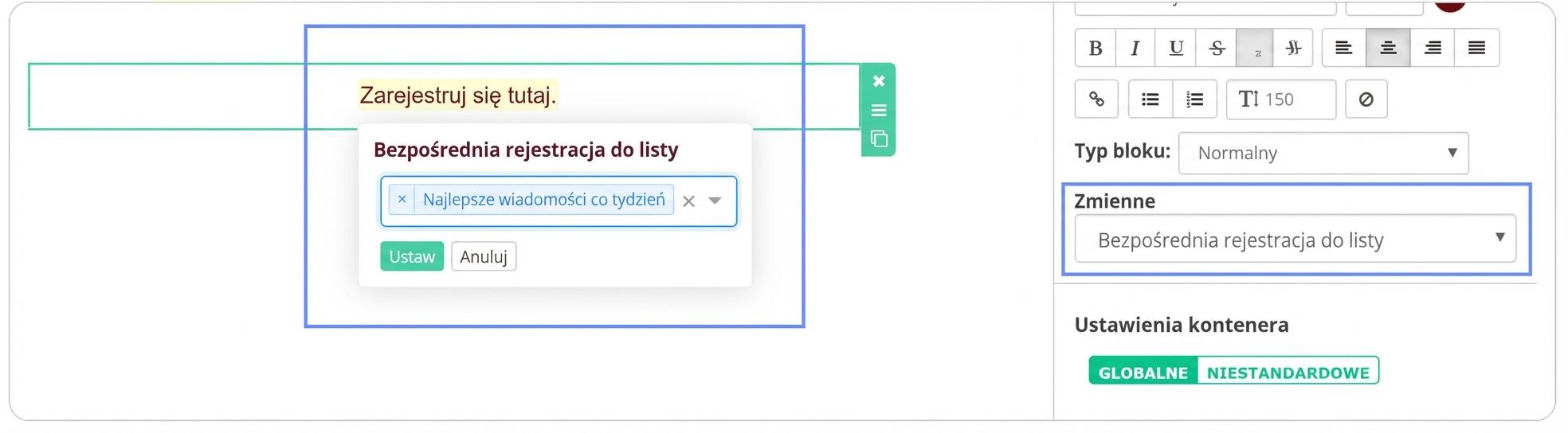 Na przycisk lub do tekstu wstaw zmienną „Bezpośredni zapis do listy” i pozostaw pole wyboru listy puste. Dzięki temu zainteresowany po kliknięciu linku zostanie automatycznie przekierowany na stronę wypisu, gdzie może zapisać się na informacje, które go interesują. Aby listy subskrybentów wyświetlały się na stronie wypisu, muszą być ustawione w stanie publicznym.