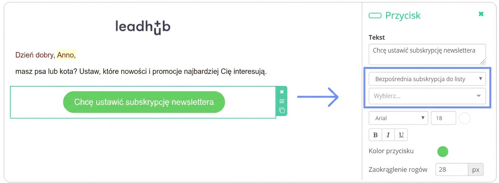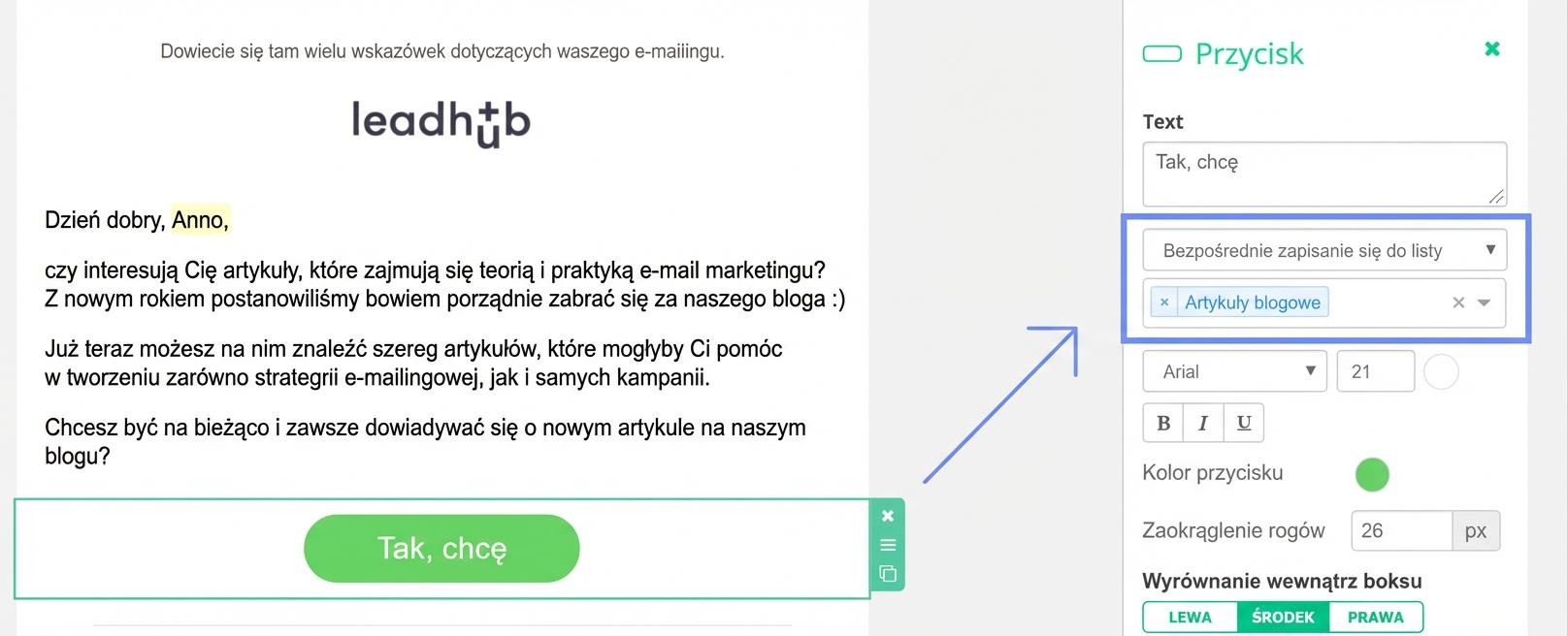 Do Leadhubu dodaliśmy nowe wartości zmiennych, które można wstawiać albo jako tekst, albo jako akcję bezpośrednio na przycisk.