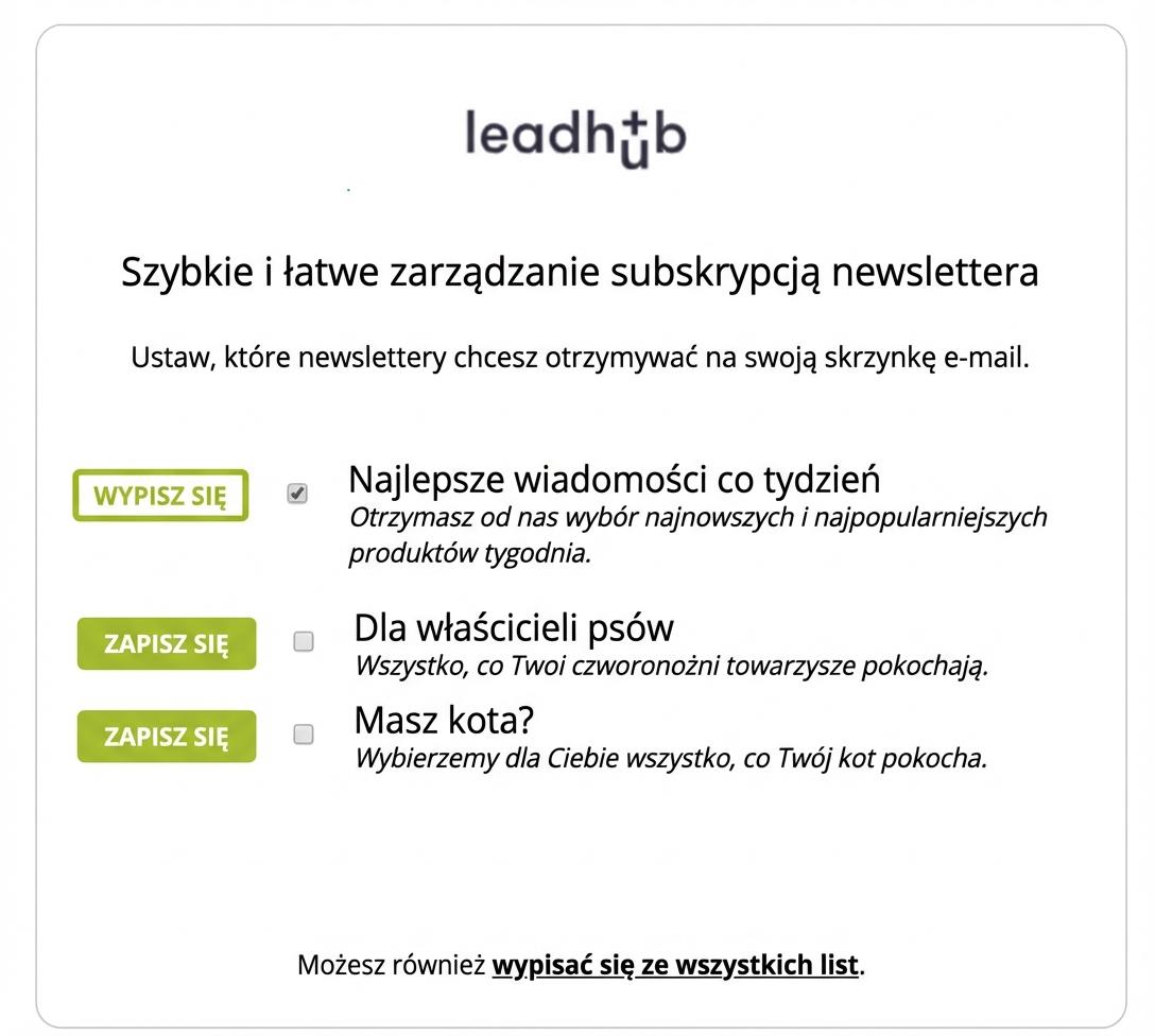 Strona wypisu wyświetli się każdemu zainteresowanemu po kliknięciu linku wypisu, który musi znajdować się w stopce każdego e-maila. Na tej stronie wyświetlą się wszystkie Twoje publiczne listy subskrybentów, które masz utworzone w Leadhubie, wraz z ich opisami — co zyska, zapisując się do danej listy. Co z tego wynika? Trzeba odpowiednio nazywać wszystkie publiczne listy subskrybentów i dodawać do nich konkretne oraz jasne opisy.