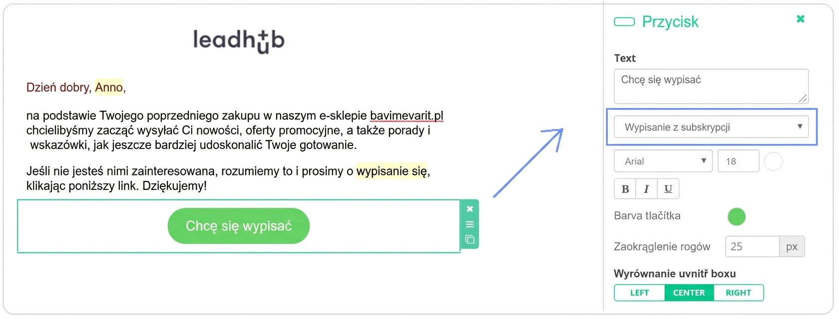 Do przycisku lub tekstu wystarczy dodać zmienną „Wypisz się z subskrypcji”. Po kliknięciu przycisku zainteresowany zostanie natychmiast wypisany z bazy danych, w której zarejestrowany jest jego adres e-mail.
