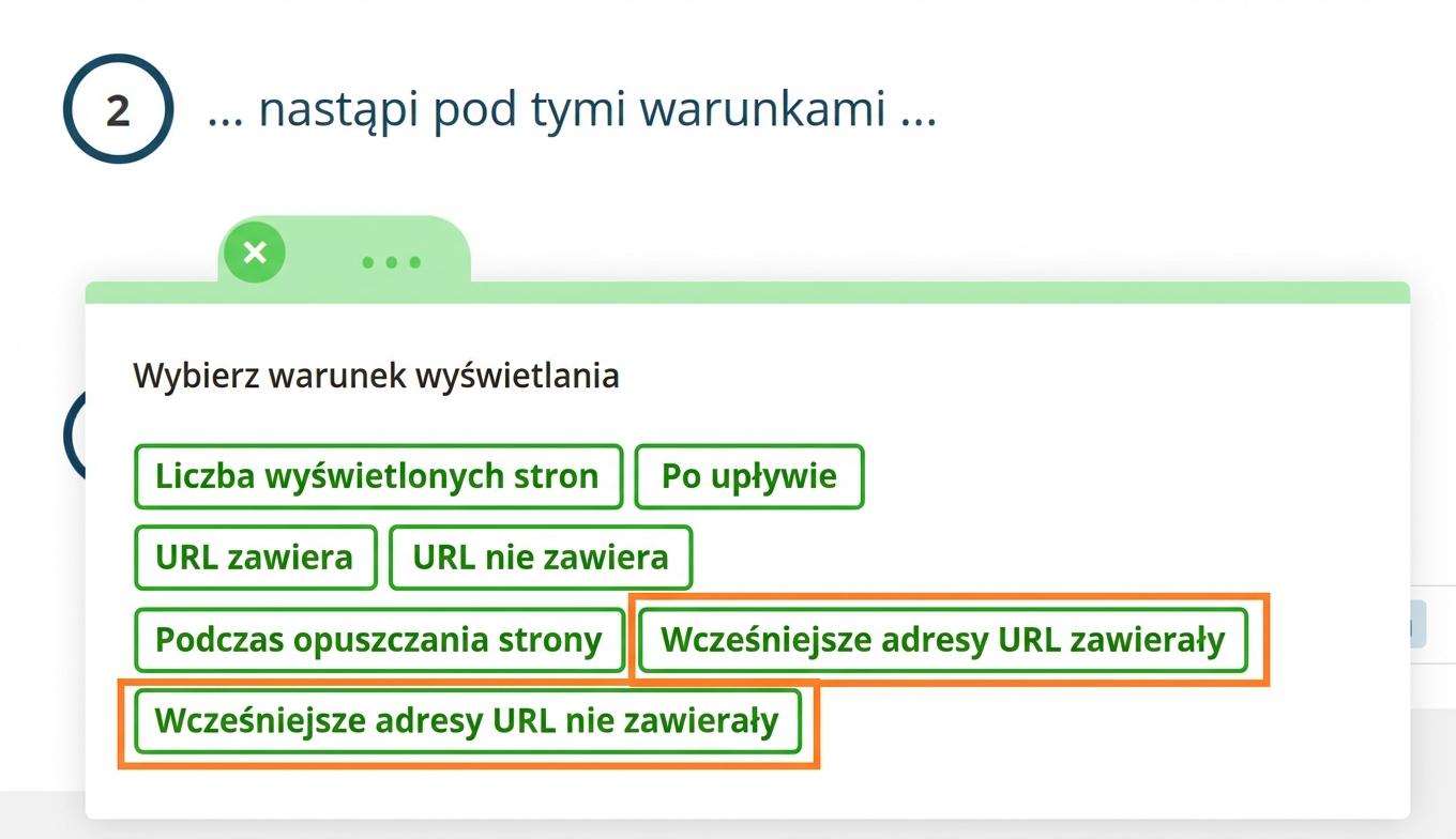 Utwórz nowy pop-up lub przejdź do szczegółów już utworzonego pop-upu. W drugim kroku możesz następnie wybrać opcję „Wcześniejsze URL nie/zawierały”: