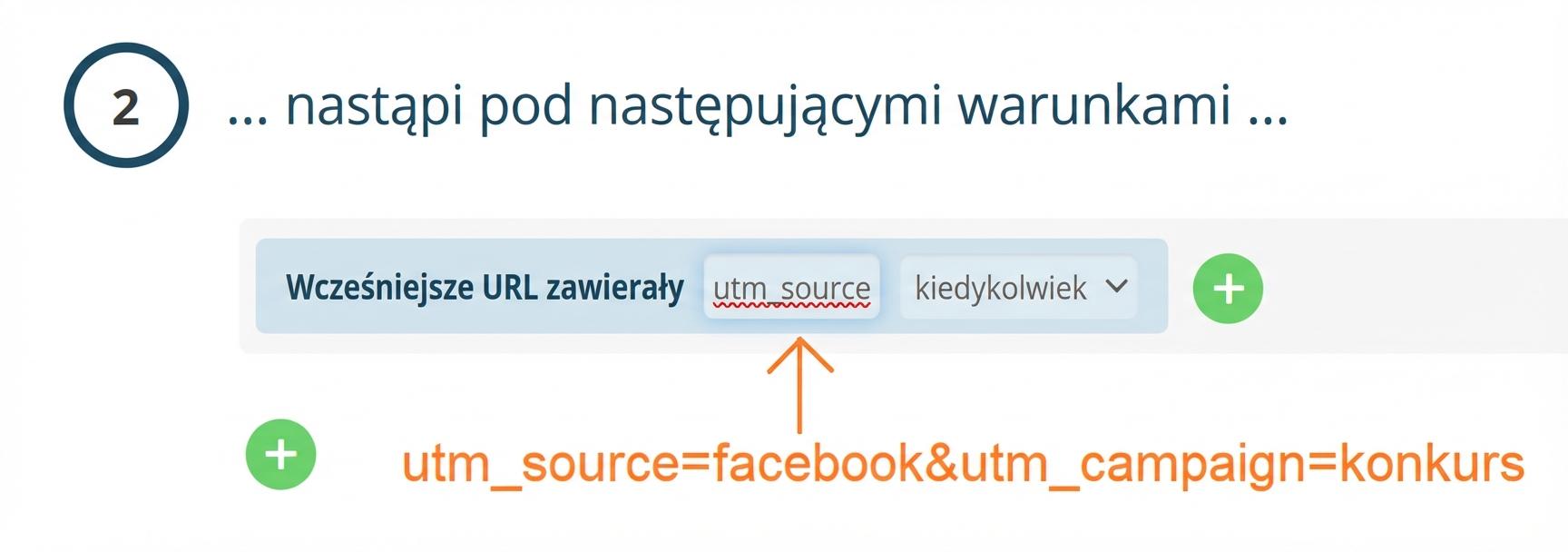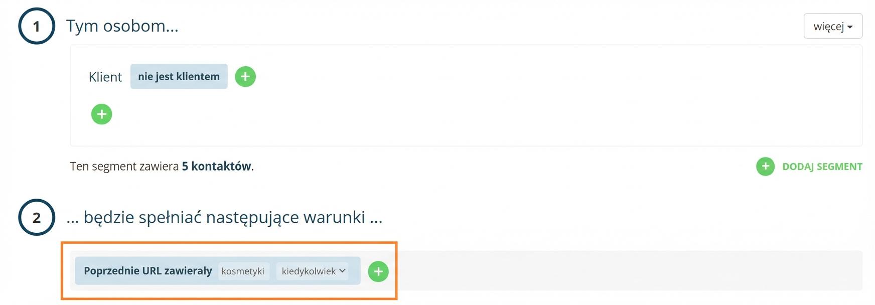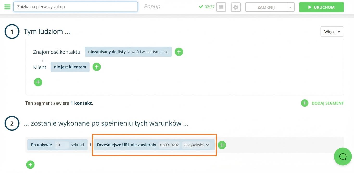 - Nowym odwiedzającym stronę oferujesz w e-sklepie zniżkę 100 zł na pierwszy zakup. Jeśli jednak odwiedzający trafi do Ciebie przez kampanię banerową RTB, chcesz mu już pokazać zniżkę 300 zł. Ustawisz więc warunek, że „Wcześniejsze URL zawierały + URL kampanii”) i tylko temu segmentowi wyświetli się pop-up ze zniżką 300 zł.