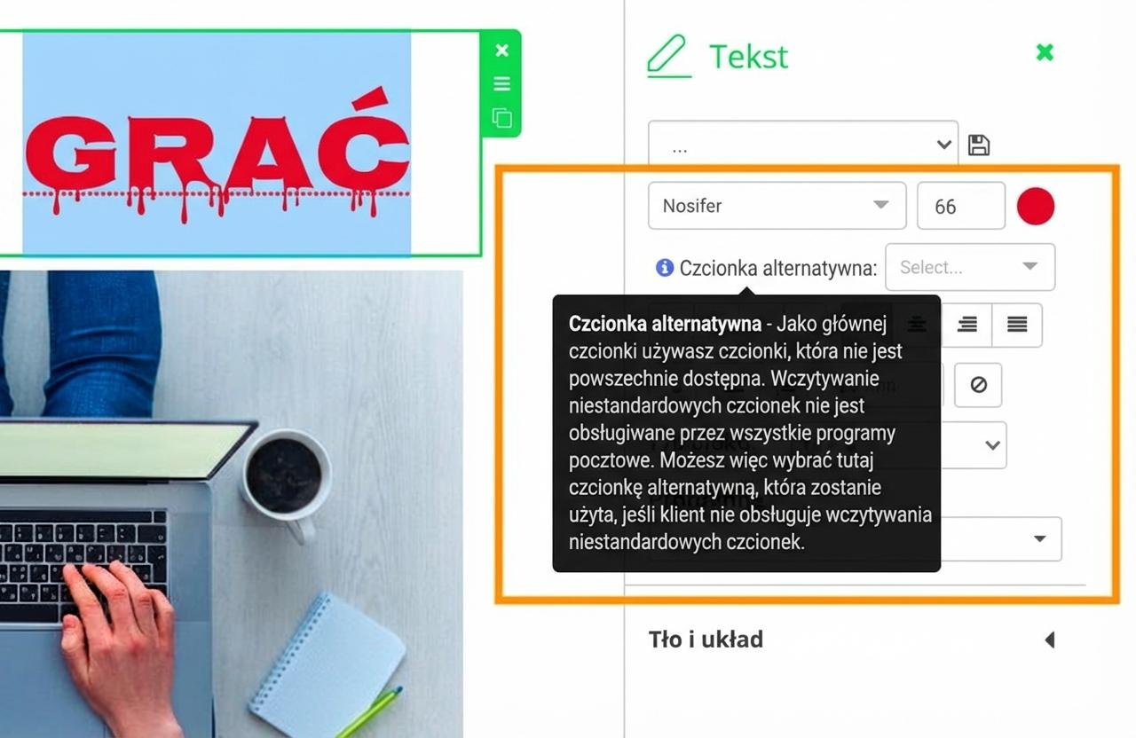 Dla fontów, które nie są kompatybilne ze wszystkimi klientami poczty e-mail, możesz wybrać czcionkę alternatywną, która zostanie użyta w niekompatybilnych klientach.