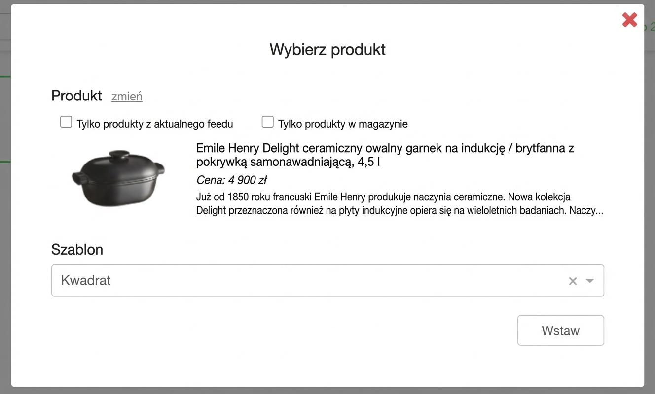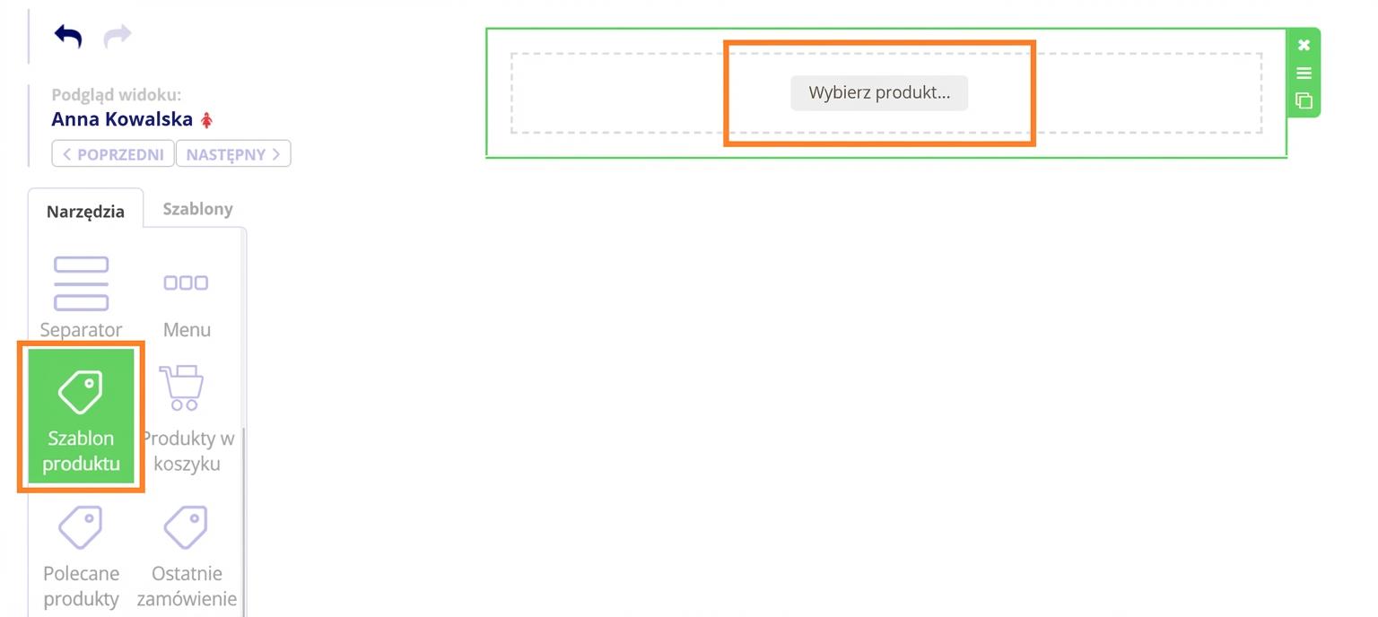 1. Przeciągnij do treści e-maila obiekt „Szablon produktów”. Kliknij opcję „Wybierz produkt”. Następnie wybierz produkt oraz szablon produktowy, który został już utworzony w ustawieniach Twojego konta, i potwierdź przyciskiem „Wstaw”.
