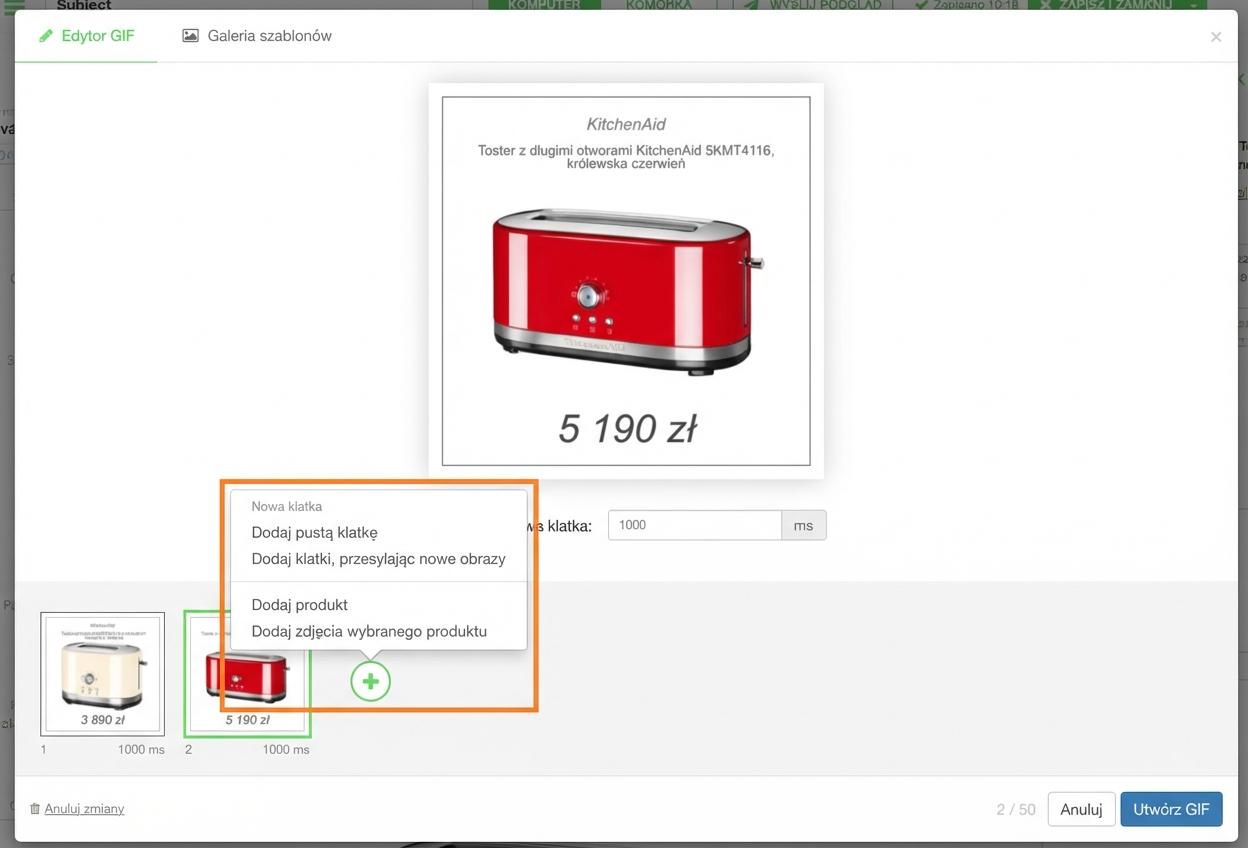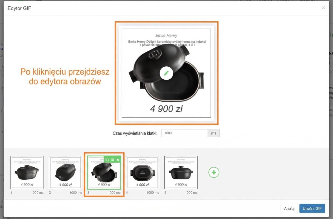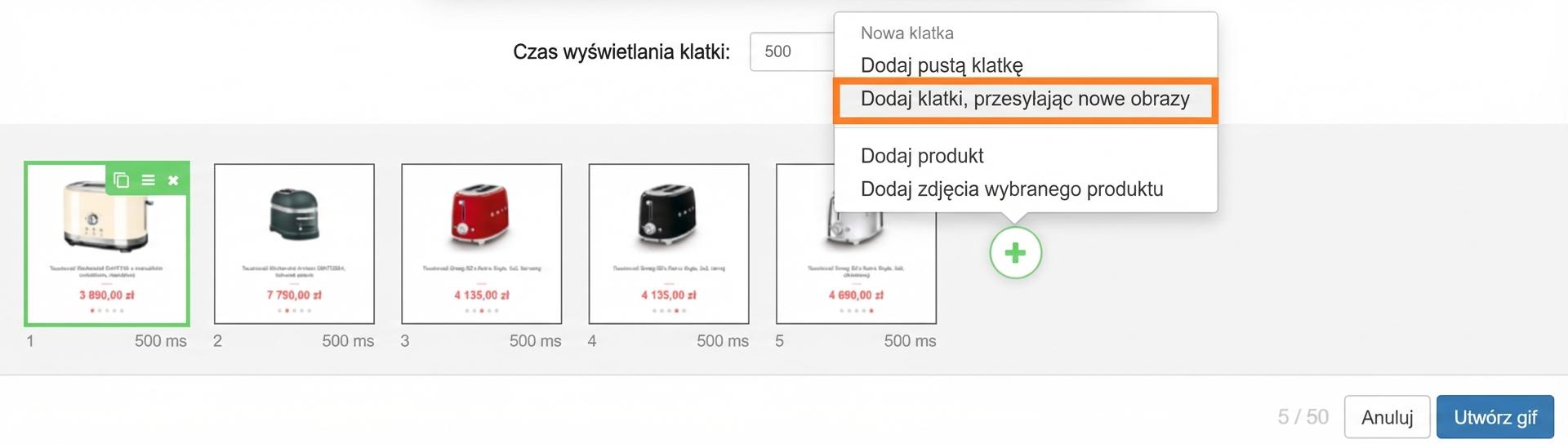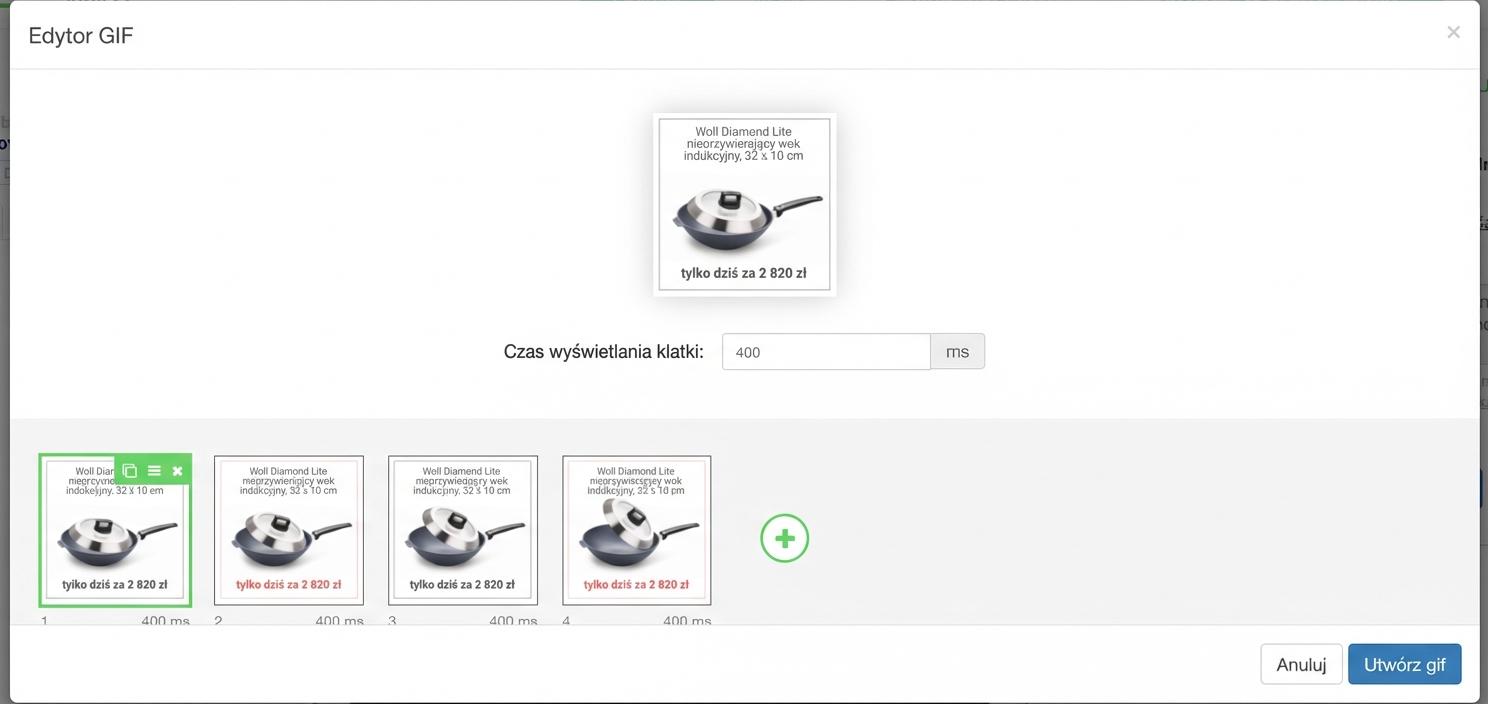 - możliwość dodania do jednego GIF kilku różnych produktów, które będą się zmieniać