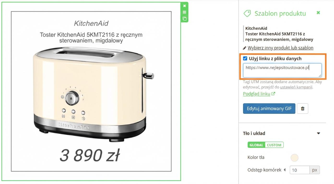 2. Do GIF dodaj odpowiedni adres URL, na który chcesz przekierować odbiorcę po kliknięciu. Jeśli go nie zmienisz, do GIF automatycznie zostanie wczytany adres URL pierwszego wybranego produktu.