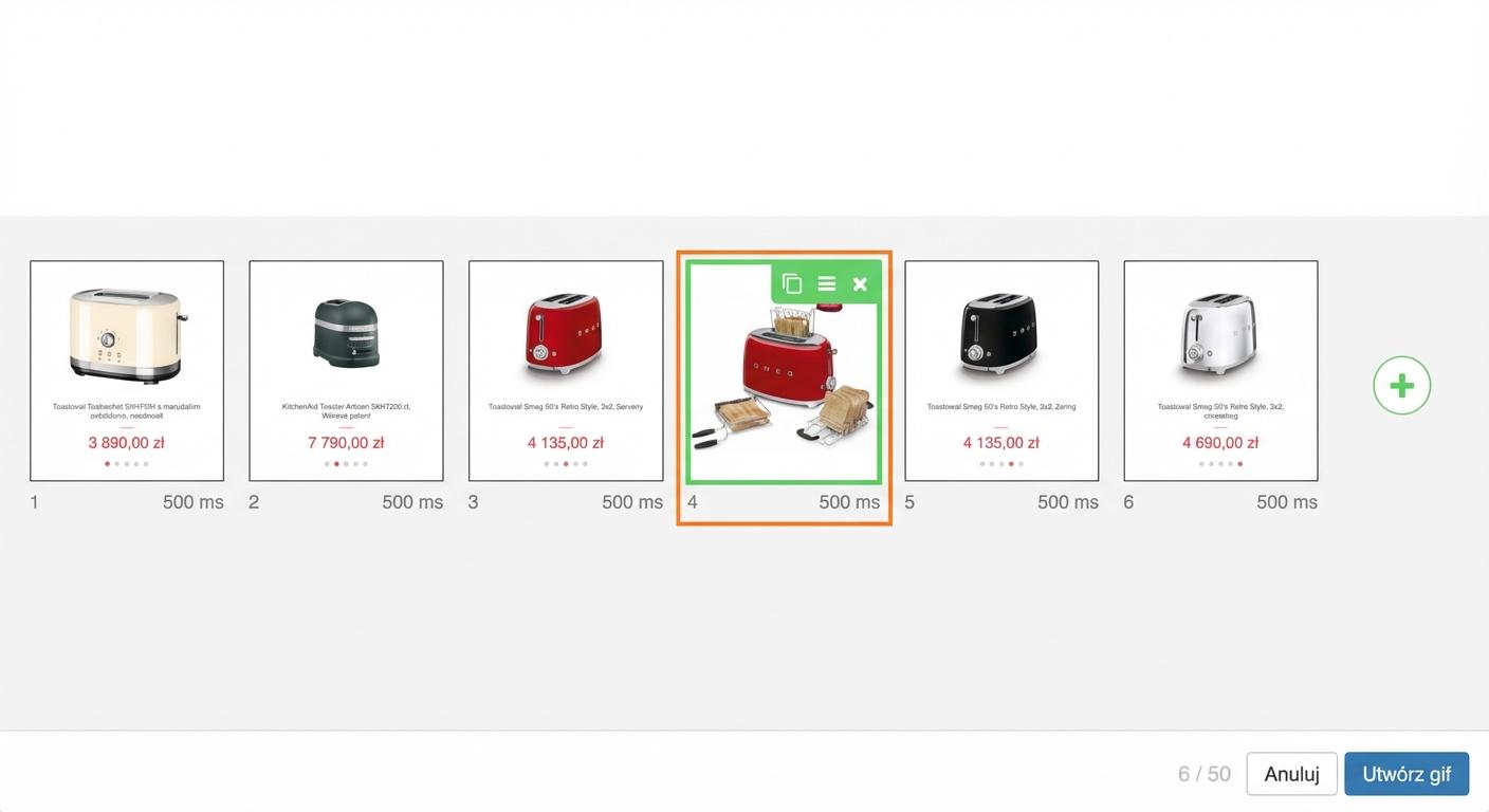 2. Kliknij przycisk „Utwórz animowany gif”, dzięki któremu przejdziesz do edytora GIF. Jeśli dla wybranego produktu dostępnych jest więcej zdjęć produktowych, wszystkie zostaną automatycznie wczytane do dolnego paska. Możesz je dowolnie przesuwać, kopiować lub usuwać te, które Ci nie pasują.