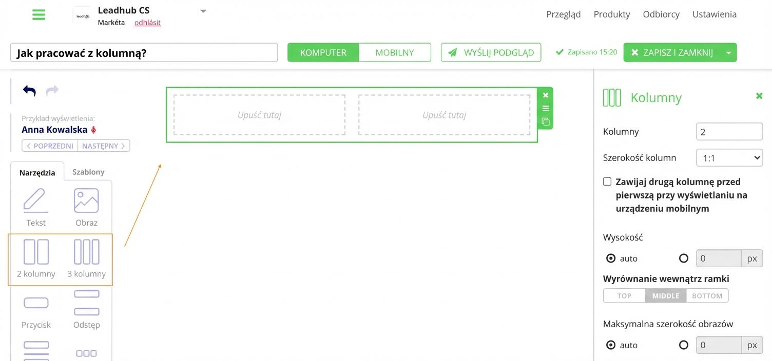 To proste. Wystarczy przeciągnąć myszą do treści e-maila opcję 2 lub 3 kolumn z lewej części edytora.