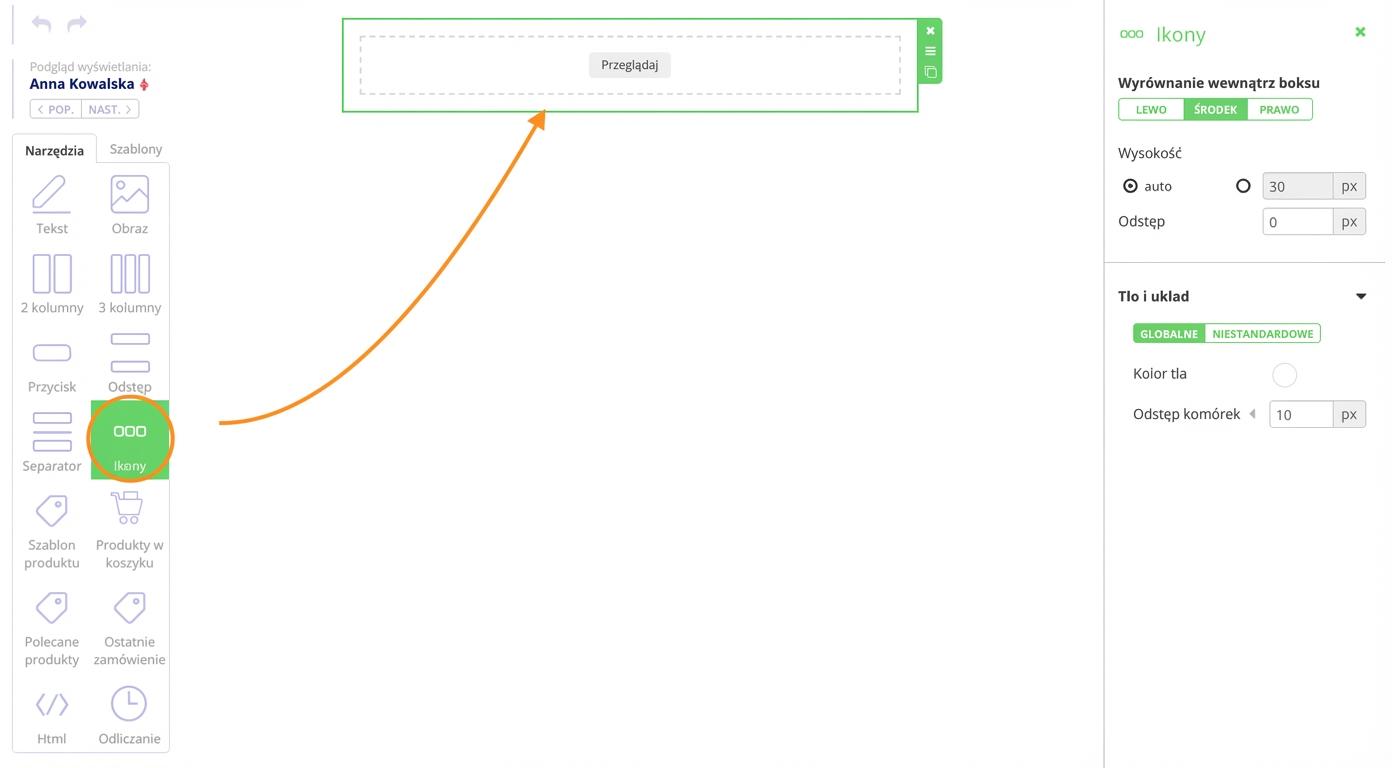 1. Przeciągnij widget „Ikonki” do treści e-maila.