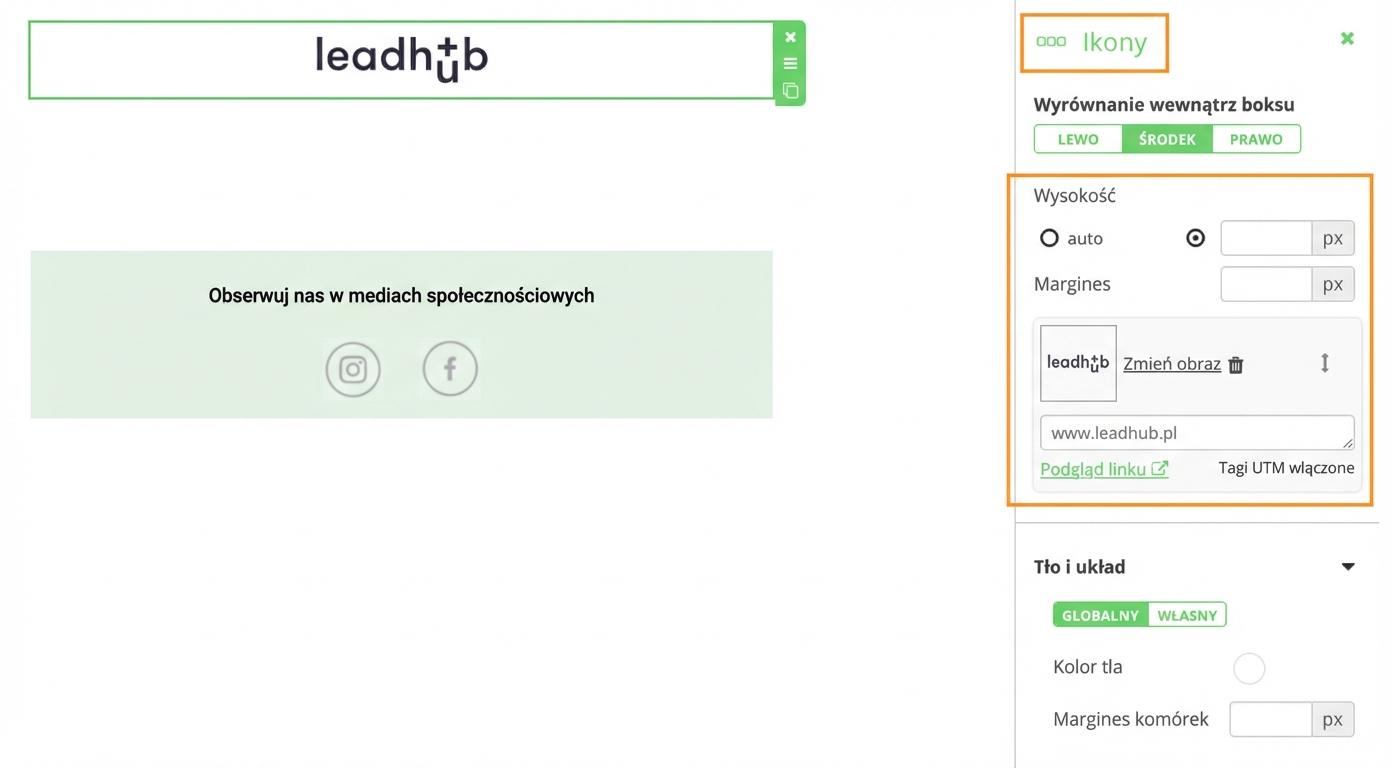 Widget „Ikony” w edytorze e-maili służy przede wszystkim do wgrywania ikonek (np. do mediów społecznościowych, innych piktogramów) lub logo.