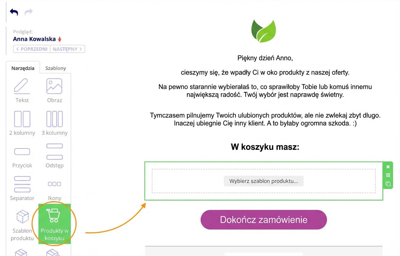 1. Przeciągnij myszą do treści e-maila element „Produkty w koszyku”.