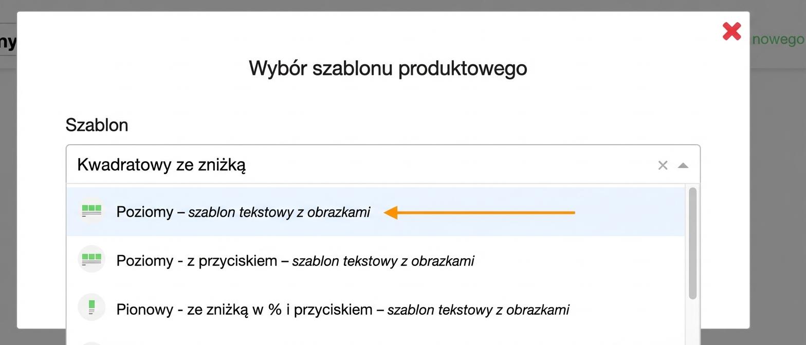 2. Kliknij „Wybierz szablon produktowy” i wybierz szablon, na podstawie którego w e-mailu wyświetlą się produkty oraz ich parametry.