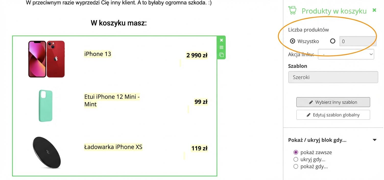 W prawej części edytora możesz wybrać, czy chcesz w e-mailu generować wszystkie produkty w koszyku, czy ograniczyć ich liczbę.