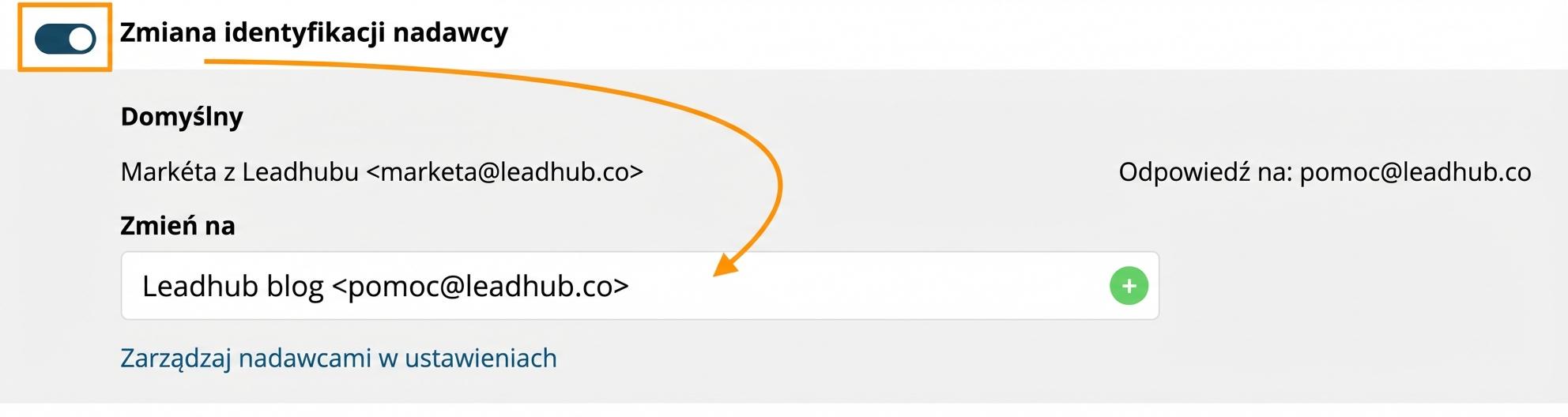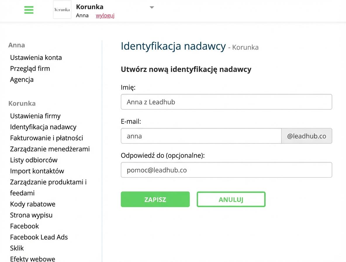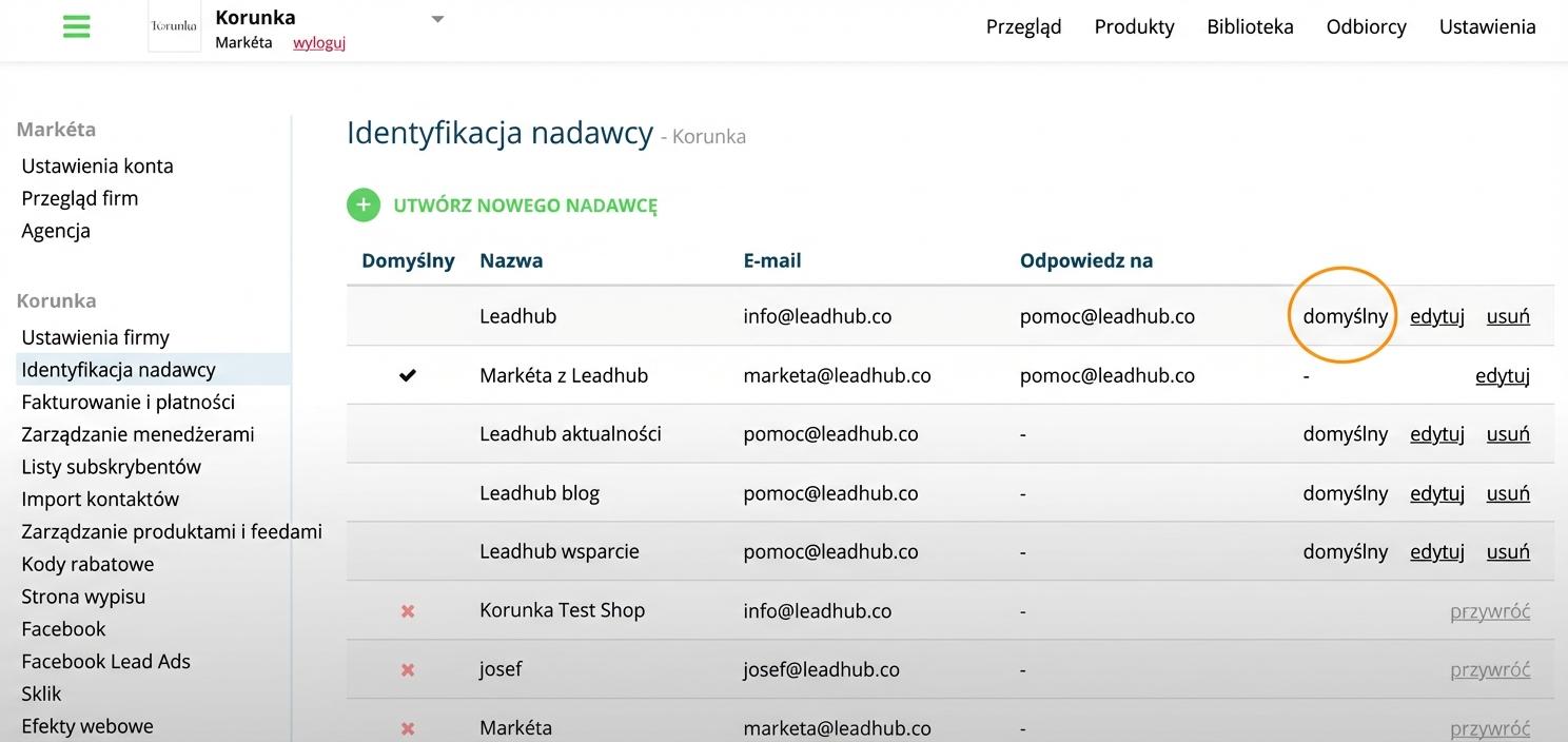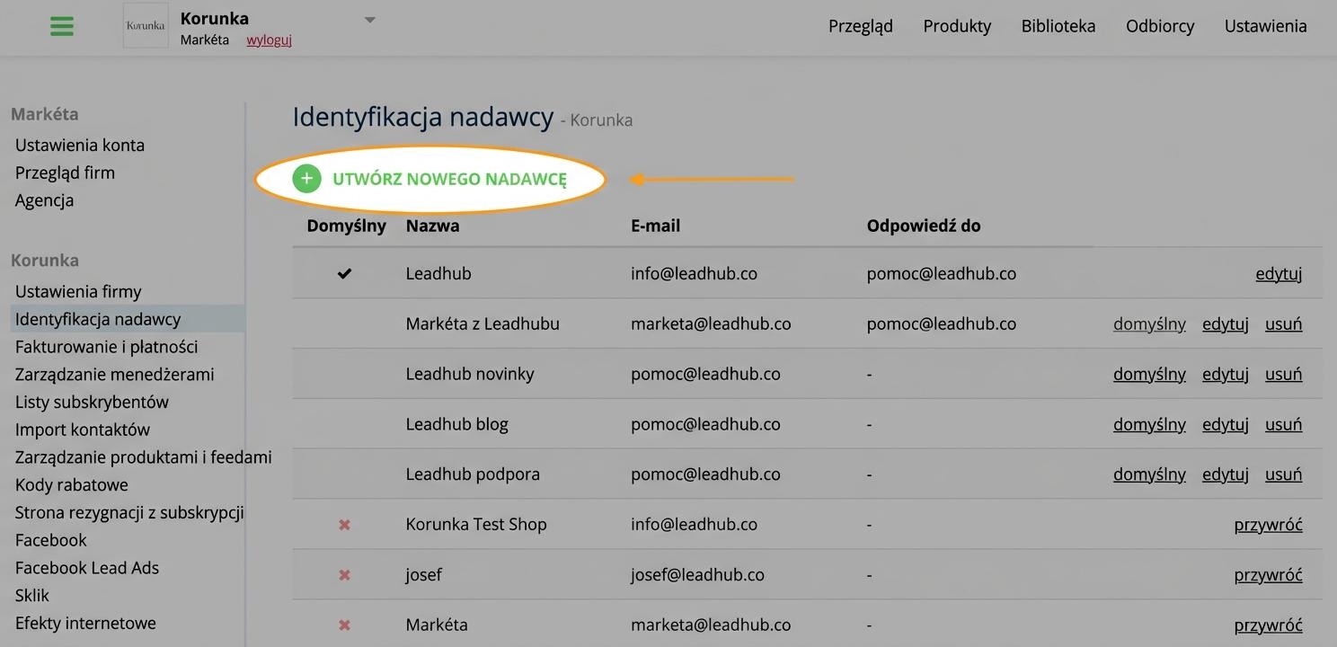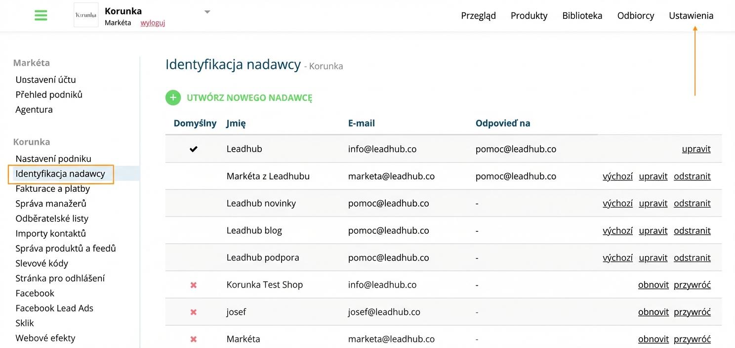 Dzięki tej funkcji możesz w Leadhubie używać wielu nadawców kampanii e-mailowych (np. "Jana z Korunka.pl" <jana@korunka.cz> lub "Nowości z Korunka.pl" <info@korunka.cz>).