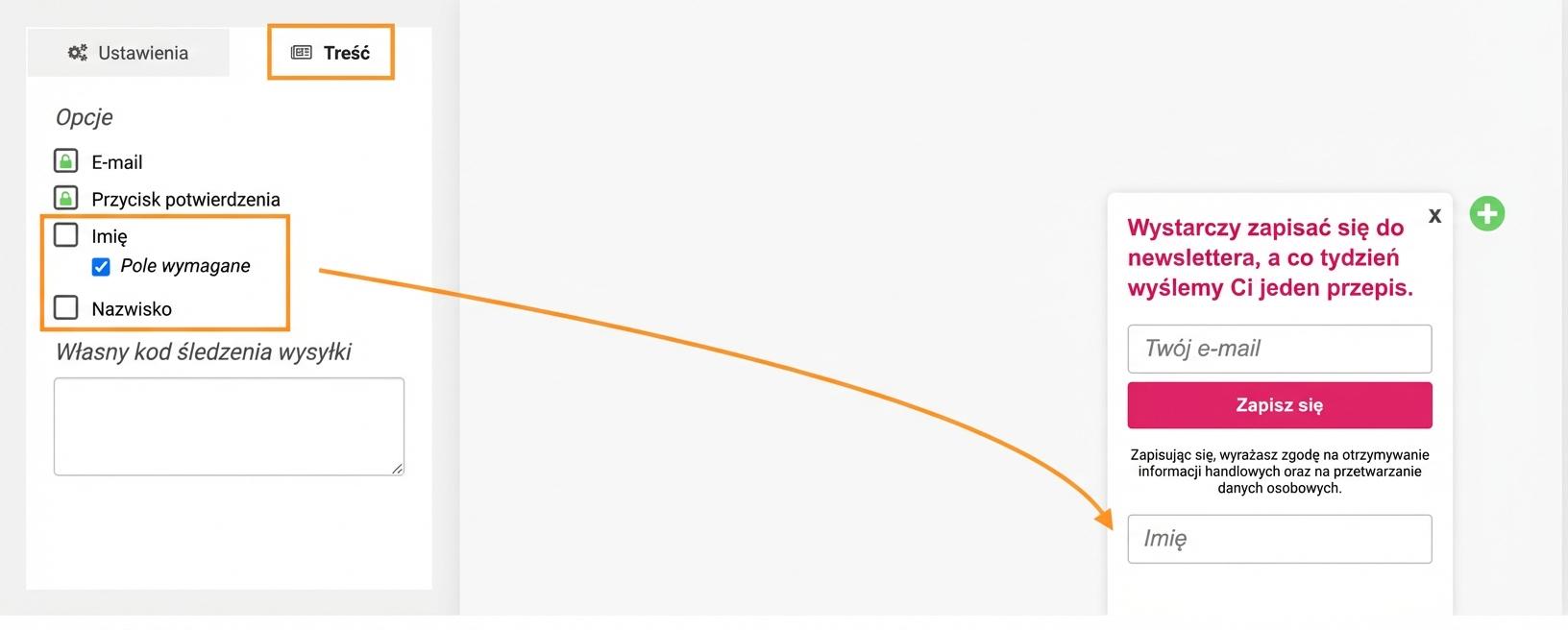 Do pop-upu możesz dodać pole na imię lub nazwisko i ustawić, czy pole jest obowiązkowe do wypełnienia, czy wręcz przeciwnie.