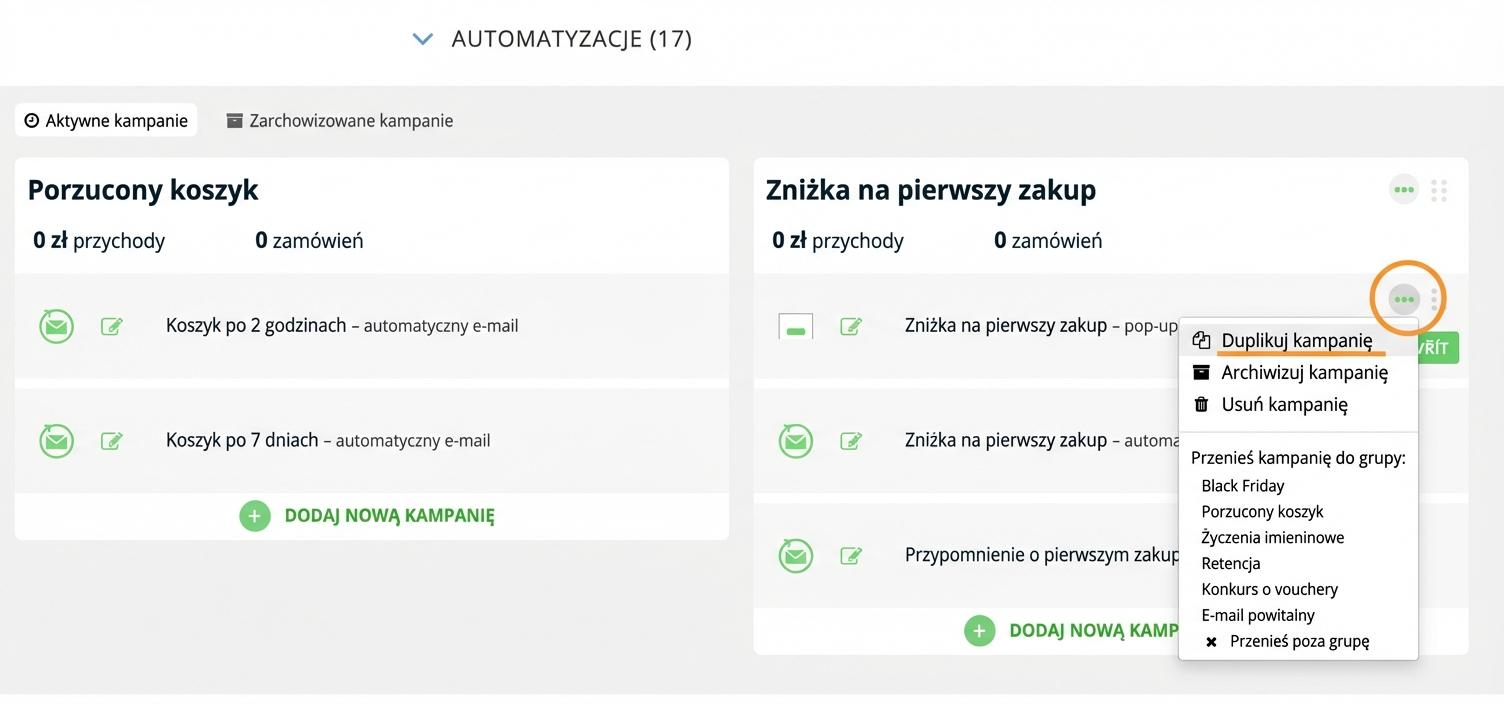 Każdą kampanię w Leadhubie możesz zduplikować, klikając trzy kropki bezpośrednio przy wybranej kampanii.