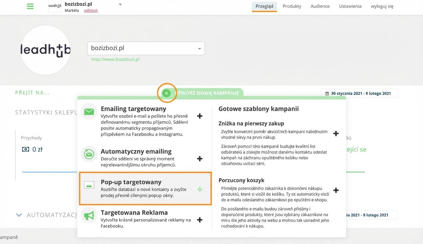W zakładce „Przegląd” wybierz opcję „Utwórz nową kampanię”, a następnie wybierz „Pop-up targetowane”.
