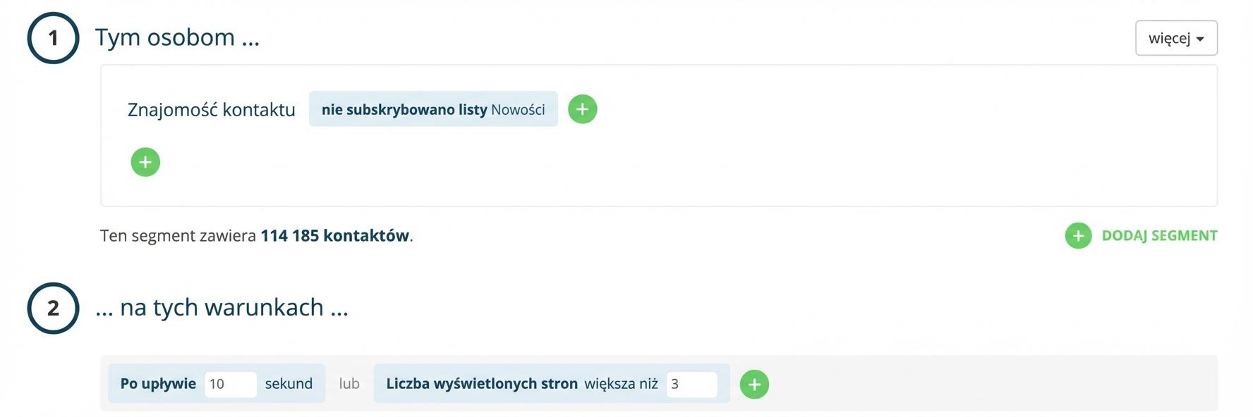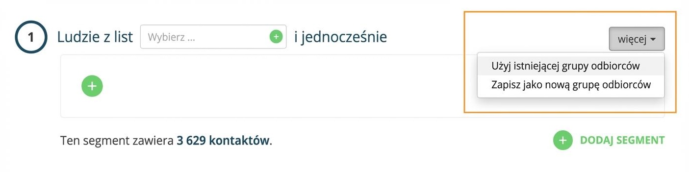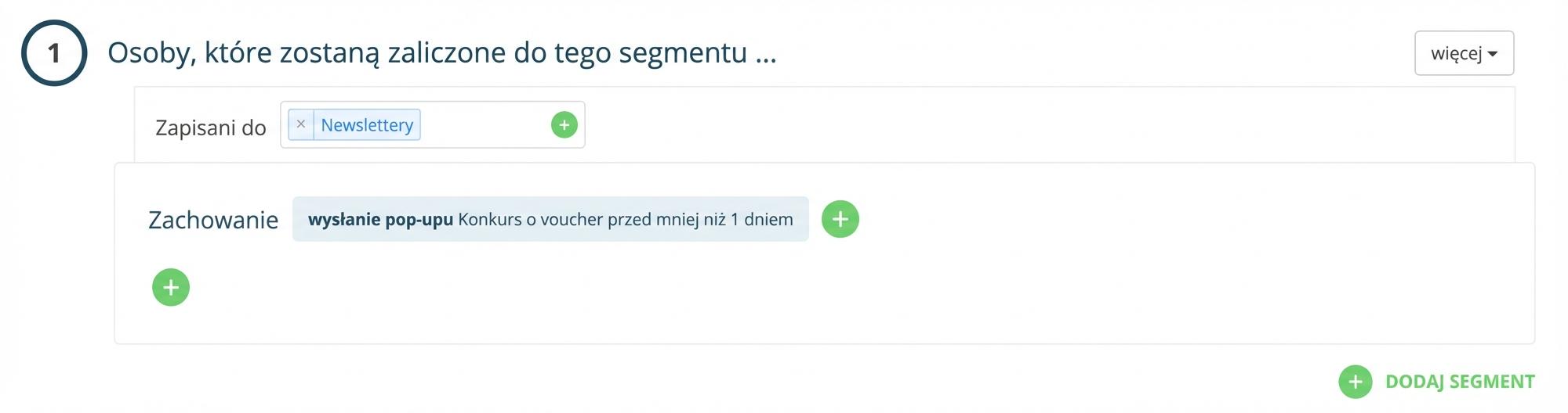 W przypadku targetowanego newslettera wybierz tę samą regułę Segmentacja co powyżej, czyli „Zachowanie – wysłali pop-up + jego nazwa mniej niż XY godzin temu” albo do targetowania użyj od razu już zapisanej grupy odbiorców. Reguły Segmentacja przeniosą się wtedy automatycznie.